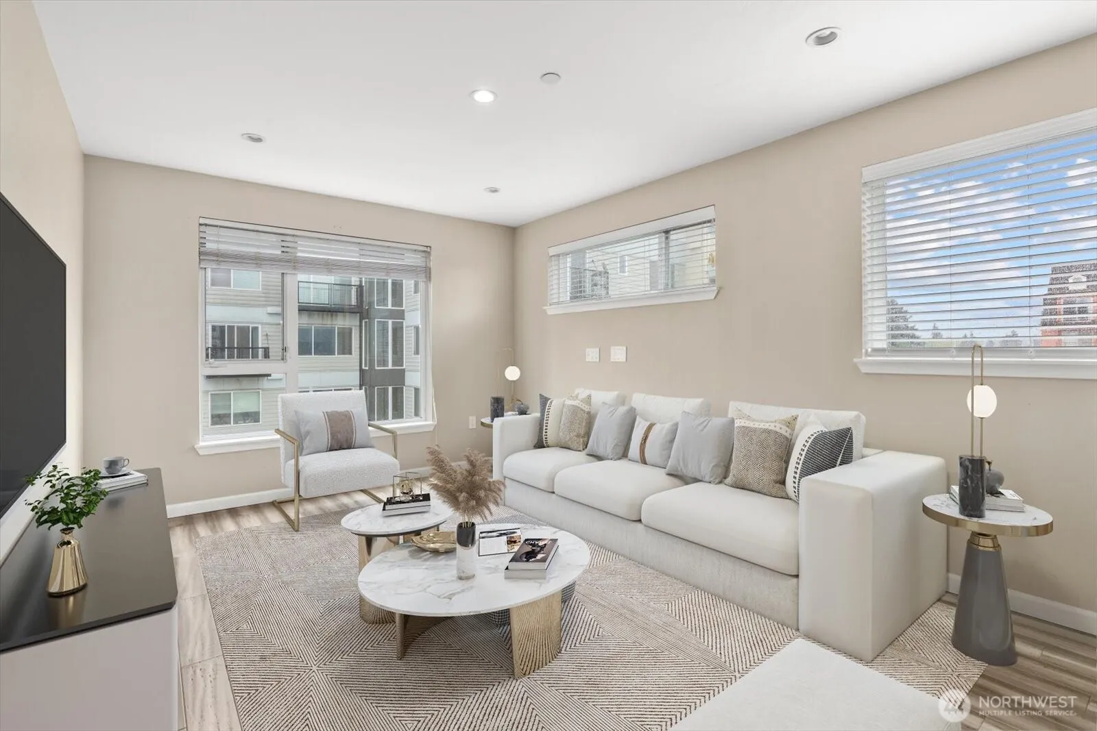Bright, corner condo at The Luminaire –Steps from restaurants , breweries , parks and the farmers market. Very nice airy, light-filled living space ,new flooring ,and a sleek kitchen with stainless appliances and breakfast bar, Spacious walk-in closet , in-unit washer/dryer, secure lobby, and TWO assigned garage spaces .HOA covers water, sewer, garbage and central hot water , no rental cap ! Walk score of 91. Quick access to I-5, Lake City Way/Bothell Way access for easy commute .