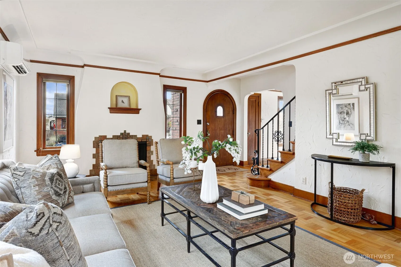 Meet Green Lake’s storybook Tudor that instantly charms with timeless architecture and beautifully maintained character. Step in through a picturesque entry into a light-filled living room featuring parquet floors, coved ceilings, expansive leaded-glass windows and a wood-burning fireplace to anchor the space. Original woodwork and trim add warmth and authenticity throughout, while thoughtful landscaping surrounds the home with privacy and abundant natural light. The dining room flows into a spacious eat-in kitchen, where French doors open to an oversized deck – ideal for outdoor dining and effortless entertaining. The fenced yard offers a patio, mature landscaping, and room to relax and play. Upstairs, the generous primary bedrooms features vaulted ceilings, abundant closet space, hardwood floors, and a fun bonus loft. A second spacious bedroom (with gracious closet space) and full bath complete this level. The lower level adds even more versatility with a large bedroom, attached bathroom, new carpet, and a private sauna – a fun and rare luxury! Bonus storage and an attached garage complete this floor. Ductless minisplits on each floor provide year-round comfort with efficient heating and AC, plus new sewer liner and additional system updates & thoughtful home maintenance make this home move-in ready. With an unbeatable location just steps from Green Lake and easy access to 99 and I5, plus so many great walkable amenities, this truly special Tudor is a must-see.