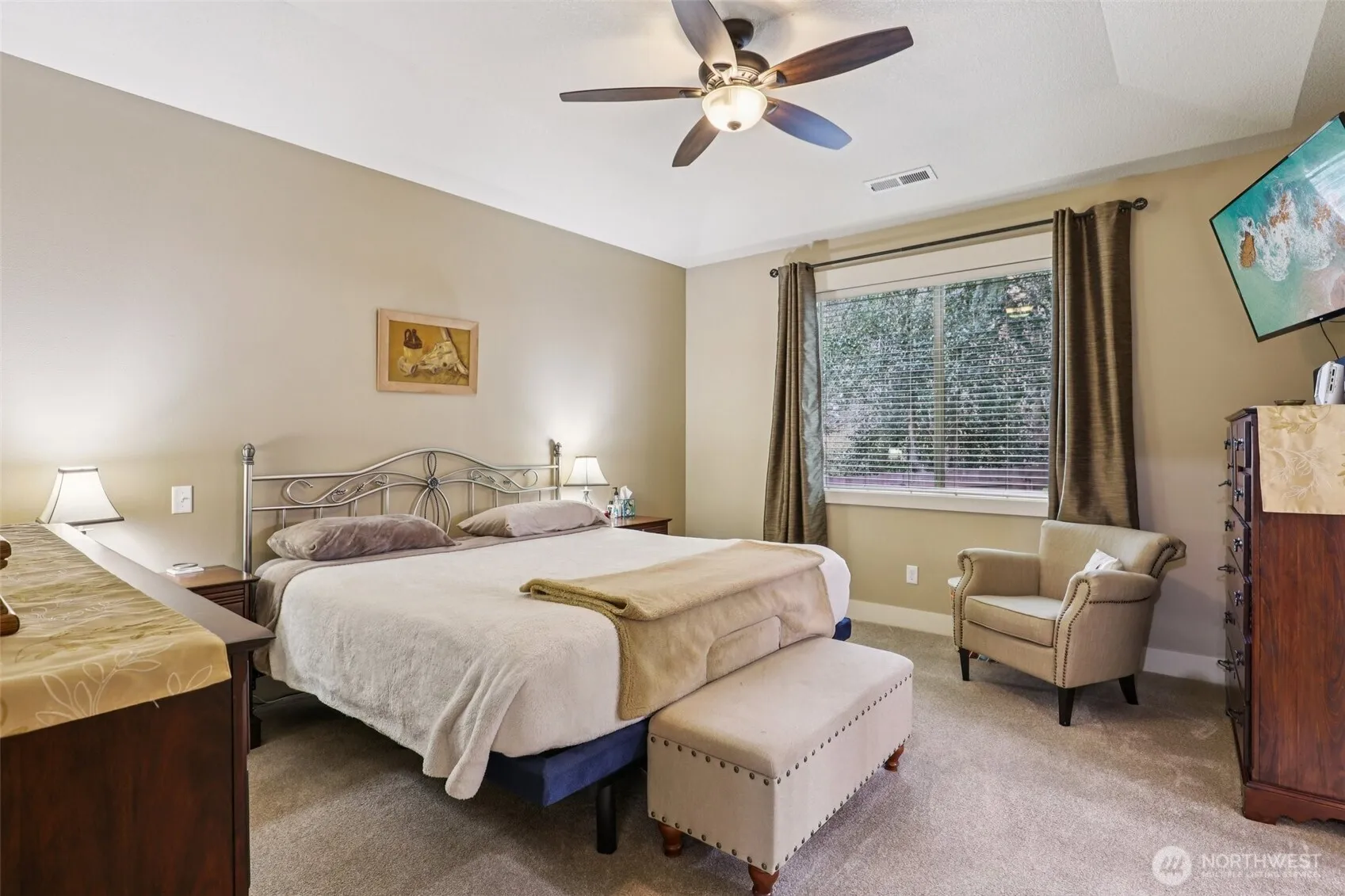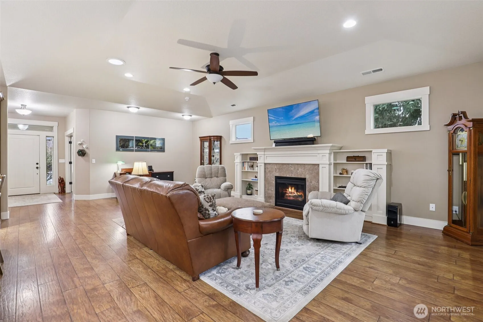 Tucked into the peaceful Pleasant Valley area, this beautifully crafted custom single-level home offers privacy, character, and exceptional design. Backing to acreage properties and framed by mature trees, the setting provides a sense of quiet seclusion while still being part of a welcoming neighborhood.The backyard is private with thoughtful landscaping, a water feature, paver patio seating area, a covered deck, and a fully fenced yard complete with an adorable garden shed. Inside, the home opens to a warm and inviting great room where a gas fireplace and custom built-ins anchor the space. The kitchen is designed for both everyday living and entertaining, featuring an expansive granite island, a gas range with a knotty alder hood vent, three ovens, and a dining area just off the kitchen. Oversized walk-in pantry. and decorative cabinets. The adjoining living area offers generous space with an additional sitting area. A private office or den provides the perfect work-from-home space. The primary suite is quietly positioned at the back of the home and includes a soaking tub, walk-in shower, and a large walk-in closet. Two additional bedrooms, a full bathroom, and a laundry room with sink and storage complete the layout. Mudroom off the 3-car garage. Beautiful carpentry and thoughtful craftsmanship are evident throughout the home. A welcoming covered front porch and the nearby Grey Hawk Ridge Park add to the charm and livability of this special Pleasant Valley property.