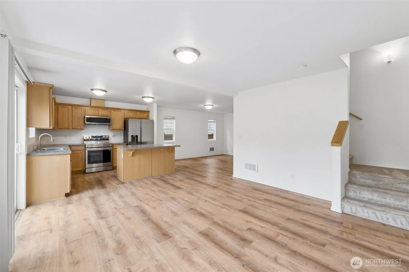 Welcome home to this beautifully maintained retreat perfectly positioned on a quiet dead-end in Radiance Community. The main floor features an expansive, open-concept living and dining area with sleek LVP flooring and a modern kitchen equipped with stainless appliances. Upstairs, you’ll find two spacious bedrooms, each boasting its own private full bath, alongside a convenient laundry room. Enjoy the fresh feel of newer carpeting throughout the upper level and stairs. The outdoor space is a true standout, offering a large, level and fully fenced backyard that borders a peaceful green belt for ultimate privacy. With a private garage, additional off-street parking, easy I-5 access and a stunning mountain view right from your front porch, this home offers the perfect balance of serenity and accessibility. Welcome Home!