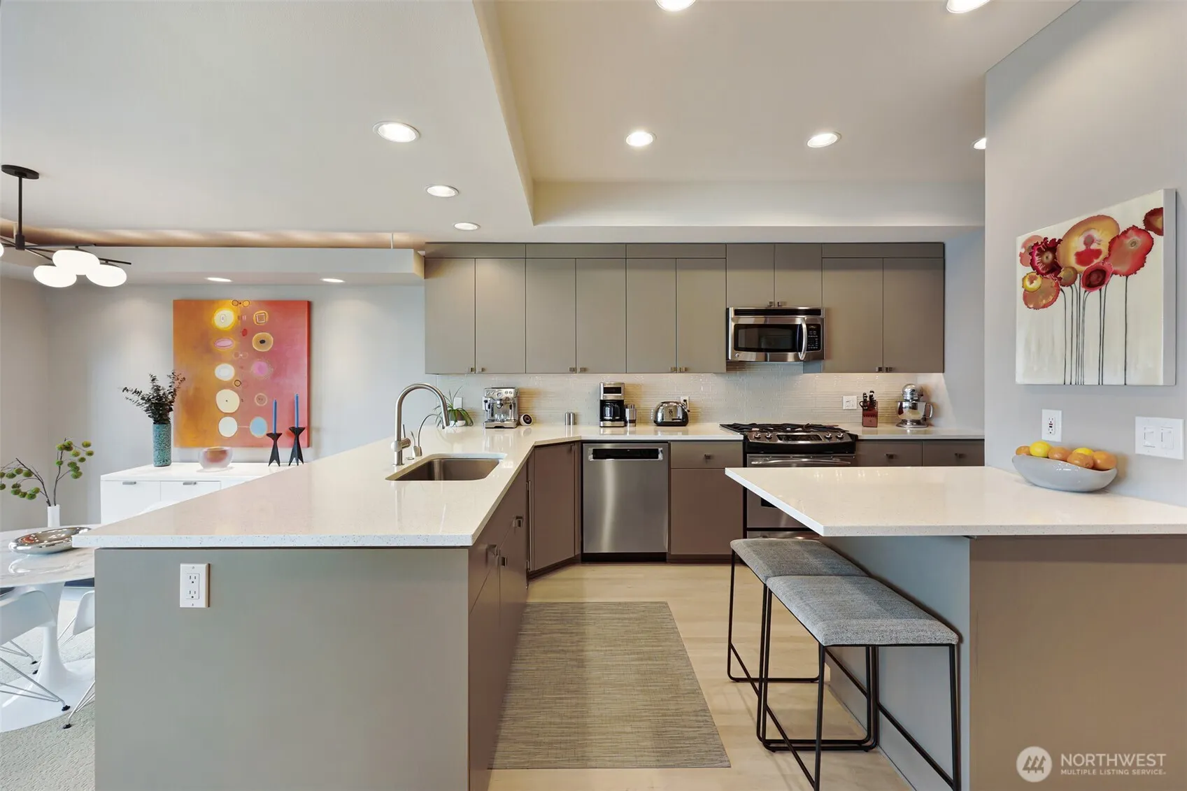 This stunning sophisticated Alki condo with floor-to-ceiling windows enjoys unmatched sweeping Sound views from the living room, dining room, kitchen and office/library. Soak in spectacular sunsets, the Olympic Mountains, gliding ferries and ever-changing marine activity all unobstructed w/o wires. This bright and open floorplan is ideal for everyday living and entertaining, and features a beautiful chefs eat-in kitchen w/walk-in pantry, two spacious bedrooms and baths – primary bedroom enjoys generous ensuite and walk-in closet – and oversize laundry room. Living is easy here with abundant in-unit storage plus additional same-floor storage room and two garage parking spots. This well-maintained, secured building with elevator and strong HOA is ideally located just steps from Alki Beach, dining, coffee shops, and the water taxi. This is a true must see!