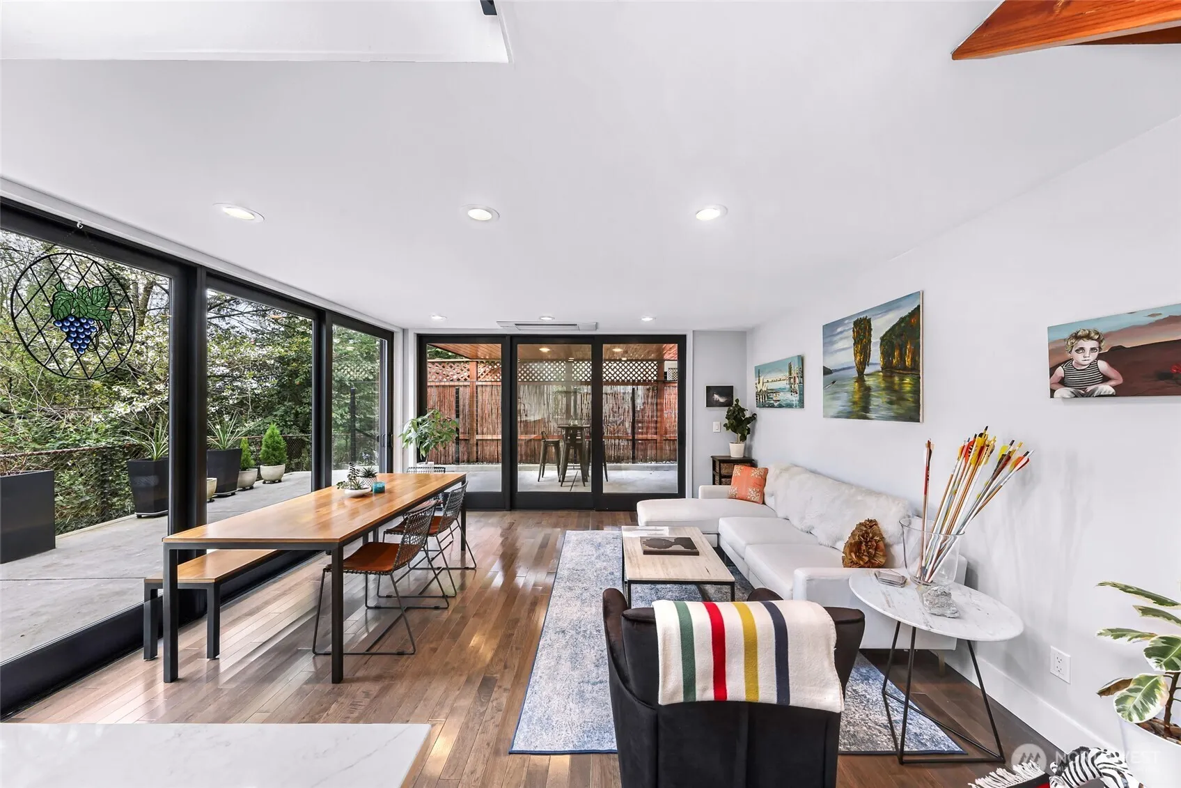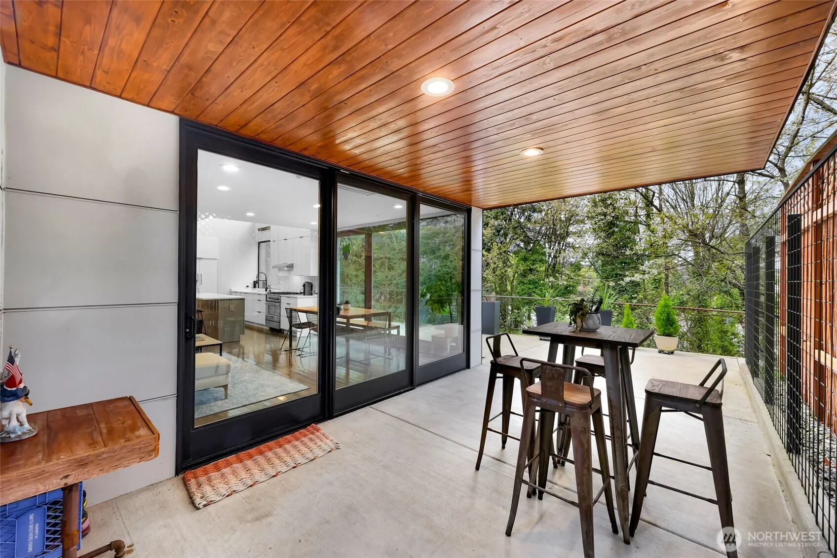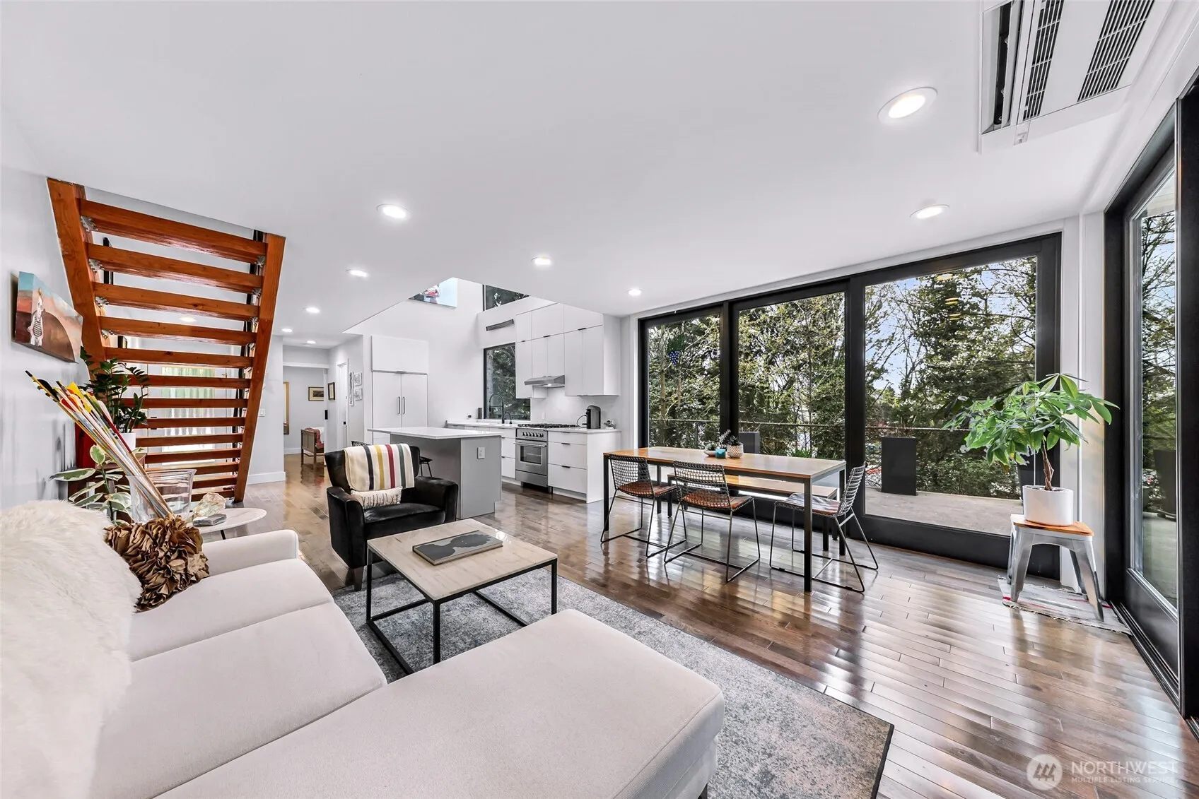 Rare Capitol Hill find, built in 2018 and tucked at the end of a quiet dead-end street, this modern home offers a unique blend of privacy, light, and unbeatable location. Surrounded by mature trees, the setting feels secluded while placing you just minutes from South Lake Union, Eastlake, downtown, and the Montlake corridor. Designed for both everyday living and entertaining, the main level features floor-to-ceiling windows that flood the home with natural light and frame a peaceful, woodsy backdrop. The kitchen anchors the space with quartz countertops, island seating, a gas cooktop, and abundant storage, opening seamlessly to the living area and a large covered patio for effortless indoor-outdoor flow. A bedroom and ¾ bath complete the main level. Upstairs, a loft-style walkway connects the primary suite to a flexible third bedroom or bonus space. The primary bath offers a spa-like steam shower, while all bathrooms feature heated floors and linen storage. Built-in closets throughout maximize functionality. The rooftop deck elevates the experience with views of the Montlake Cut and Husky Stadium lit up at night, reinforced for a hot tub, plumbed for a bbq, and plenty of room for an outdoor kitchen. A detached garage with shop space, generous off-street parking, heat pumps for year-round comfort, and a private fenced yard complete this exceptional urban retreat. Park-like freeway lid is in the works!