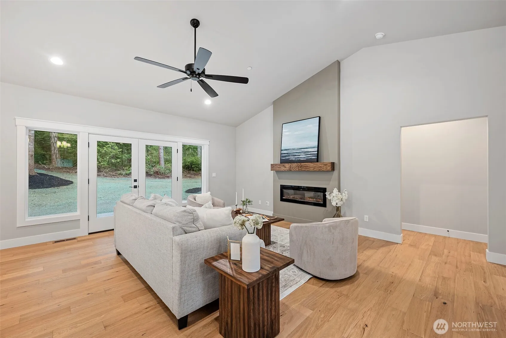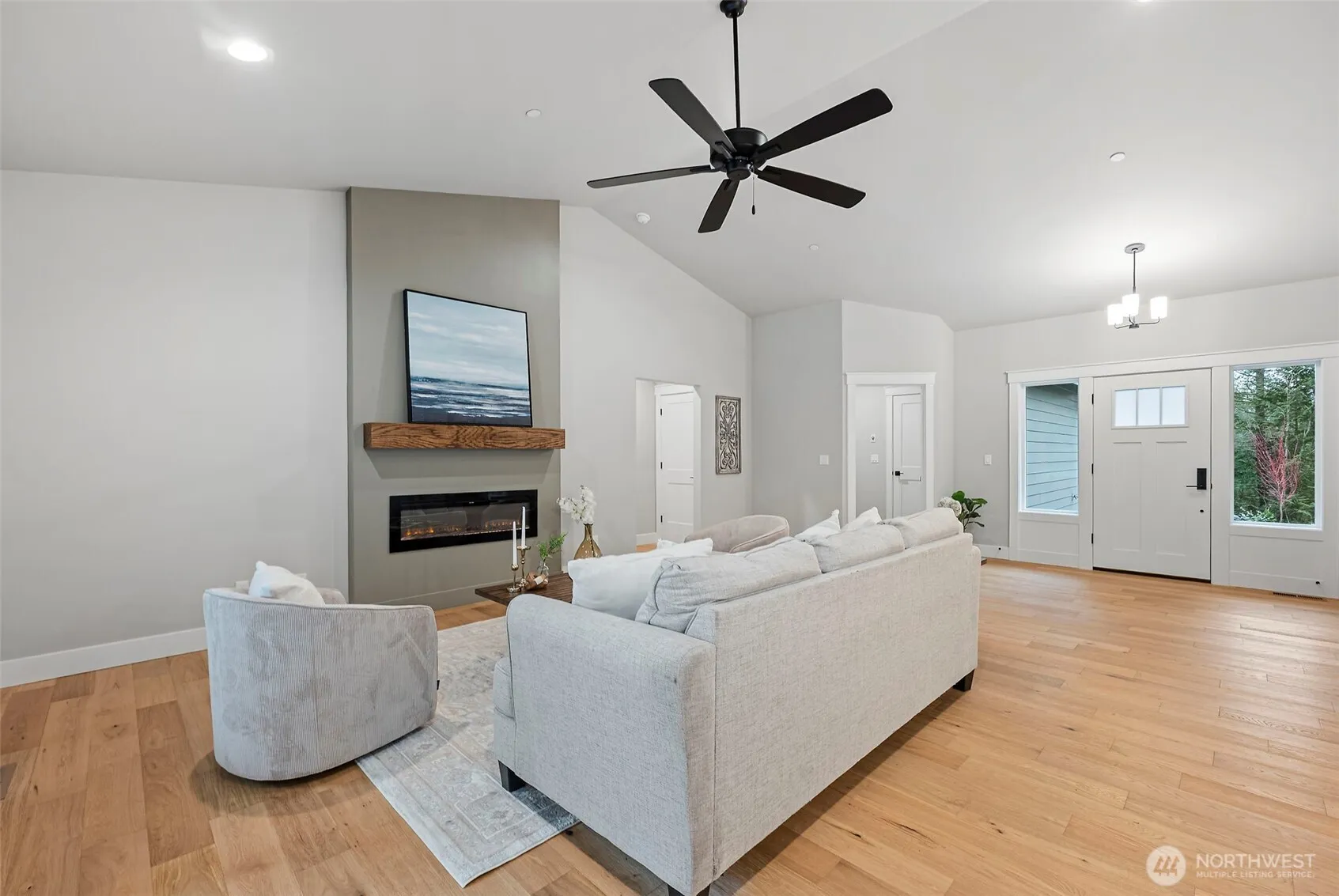 Stunning new construction rambler by Eagle Homes, ideally situated on 2.5 acres in a peaceful rural setting with convenient access to town. This thoughtfully designed 3-bedroom, 2-bath home with den blends modern luxury with timeless Northwest charm. Rich hardwood floors, beautifully painted millwork and quality craftsmanship shine throughout. The spacious great room features an electric fireplace and flows seamlessly into the open-concept kitchen, complete with quartz countertops, under cabinet lighting, and stainless steel Whirlpool appliances. The private primary suite is a true retreat, offering a spa inspired bath with a freestanding soaking tub, walk-in shower, and oversized walk-in closet. A forced air heat pump with A/C ensures year-round comfort, and 3 car garage provides generous storage. Outside, enjoy the tranquil setting, complete with backyard patio & a beloved NW fire pit area. With ample space for your RV parking, boat, or other toys, this property offers flexibility and room to breathe. This home is truly a gem!