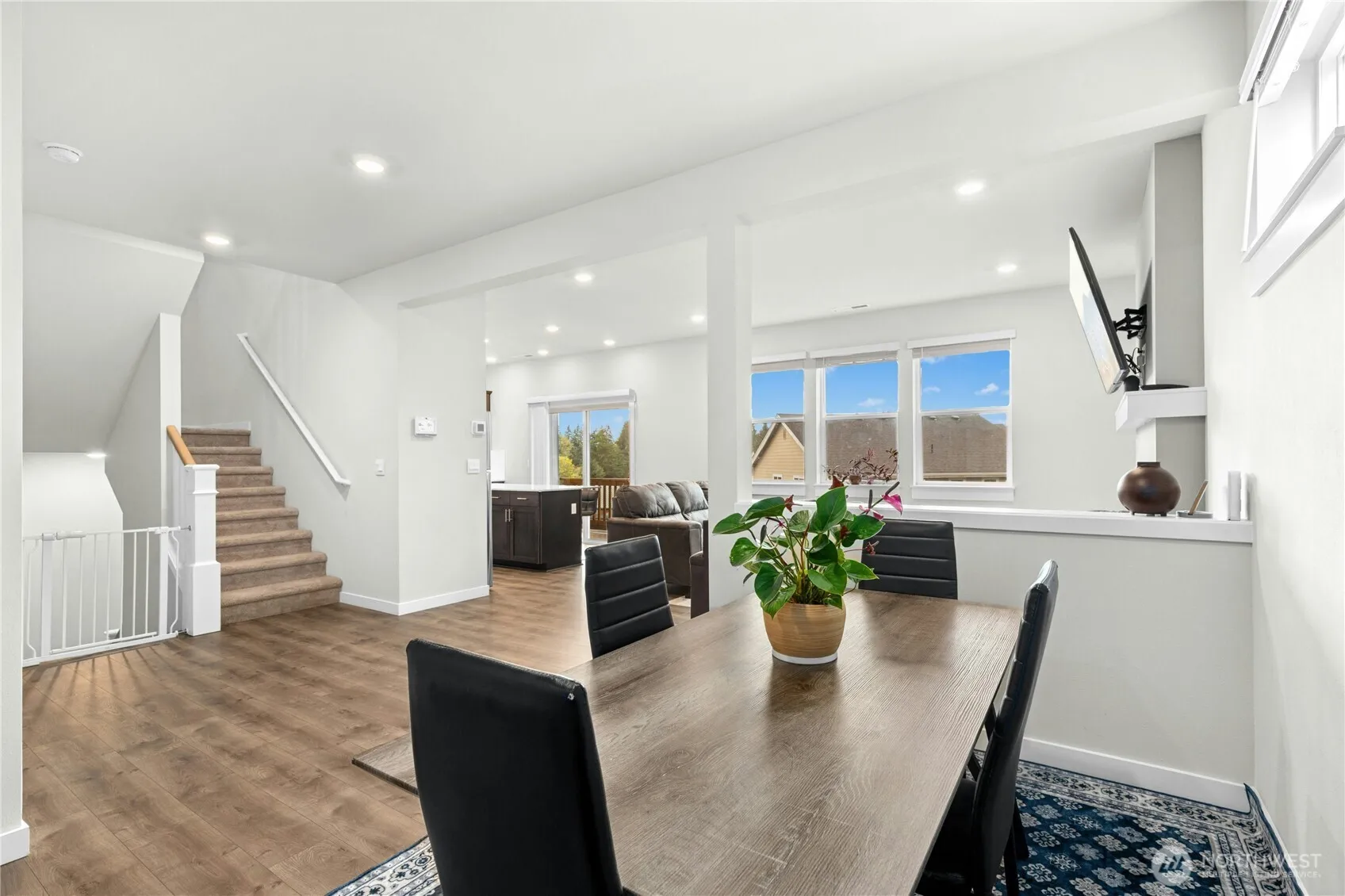 The Samish Plan is a stylish southeast-facing two-story home with a daylight basement, offering 4 bedrooms and 3.5 baths. Its open-concept design features a spacious living room flowing into a stunning kitchen with a large island—perfect for cooking, dining, and entertaining. The luxurious primary suite boasts a spa-like bath and generous walk-in closet, while upstairs bedrooms also include walk-ins for added convenience. The lower level offers a bedroom, ¾ bath, and a versatile rec room ideal for guests or a home office. The backyard is upgraded with paver stone flooring, a custom retaining wall, lush grass grass to maintain a natural backyard feel, and wooden stairs accented with white decorative stones.