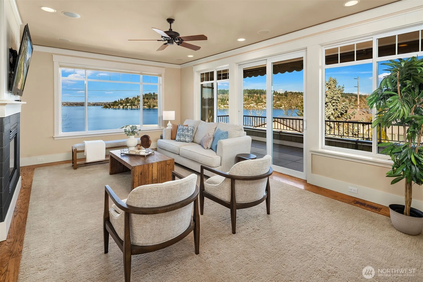 Situated in the sought-after Lower Kennydale neighborhood, this exceptional residence offers sweeping panoramic views encompassing Lake Washington, Mercer Island, and the Olympic Mountains. The home showcases refined craftsmanship and thoughtful detailing, seamlessly blending traditional and contemporary elements with a sophisticated yet inviting palette. Enjoy a tranquil and private sanctuary, free from street noise. The luxurious primary suite includes a fireplace and a secluded deck, while the office and den feature custom cabinetry. The chef’s kitchen connects to an elegant dining room that boasts a fireplace and remarkable western vistas. Outdoor dining and boat watching are available on two spacious decks. The lower level comprises a home theater and bonus room with potential for a MIL suite. Enhancing convenience, the property is equipped with a beautiful elevator. Located just minutes from Kennydale Beach Park, East Trail for walking and biking, Coulon Beach Park, SeaTac Airport, Downtown Bellevue, and Seattle, the home provides impeccable maintenance and design. It combines luxury living with rare accessibility—quick access to I-405 without freeway noise. This modern classic embodies distinguished luxury living.