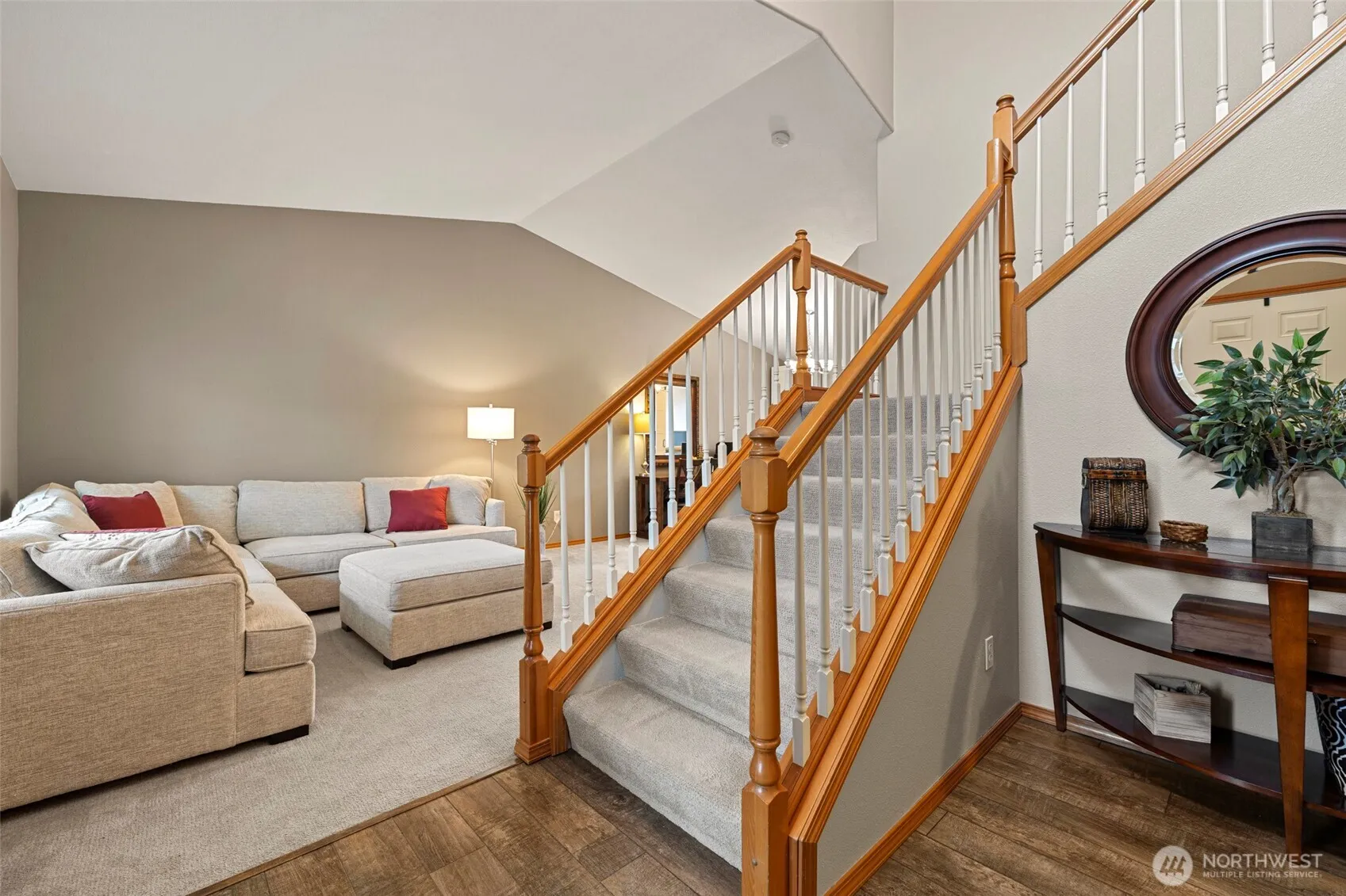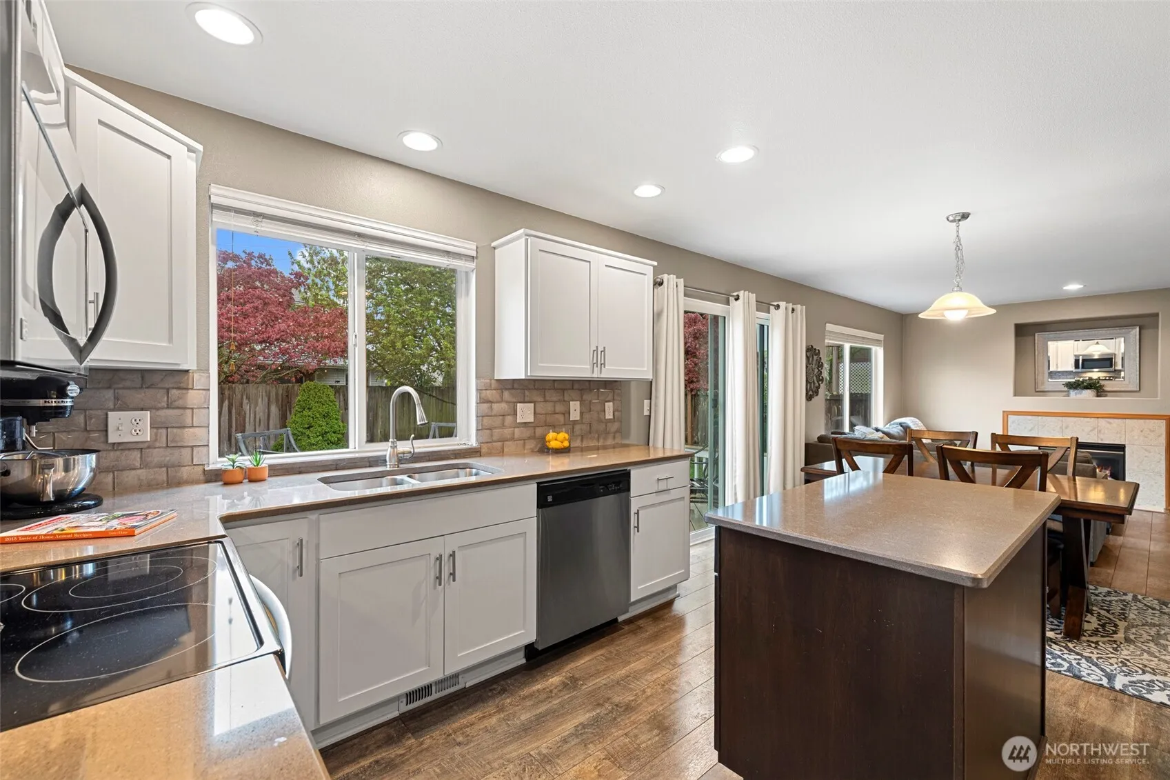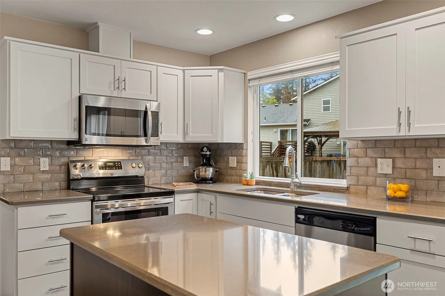 From the moment you step inside, it’s clear this sought after Silver Firs home has been loved and cared for. Vaulted ceilings greet you as you explore a turnkey home impeccably updated & meticulously maintained. Sunlight pours through highlighting a stunning kitchen remodel; shaker cabinets, quartz counters w/ island, tile backsplash, and newer appliances. The kitchen opens up to a cozy family room with gas fireplace. Head upstairs to find three bedrooms, including a serene primary suite designed for relaxation. Thoughtful updates throughout; laminate wood flooring, newer composition roof, recently redone crawlspace, and so much more. Enjoy year round comfort w/ A/C and new dual pane windows. Outside, your private oasis awaits; the expansive composite deck, covered porch, extended driveway, and fully fenced yard offer the perfect backdrop for morning coffee or weekend gatherings. Backyard features extra storage with a Tuff shed. Located amongst community parks, paths & trails, highly rated schools, & the vibrant Mill Creek Town Center is minutes away.