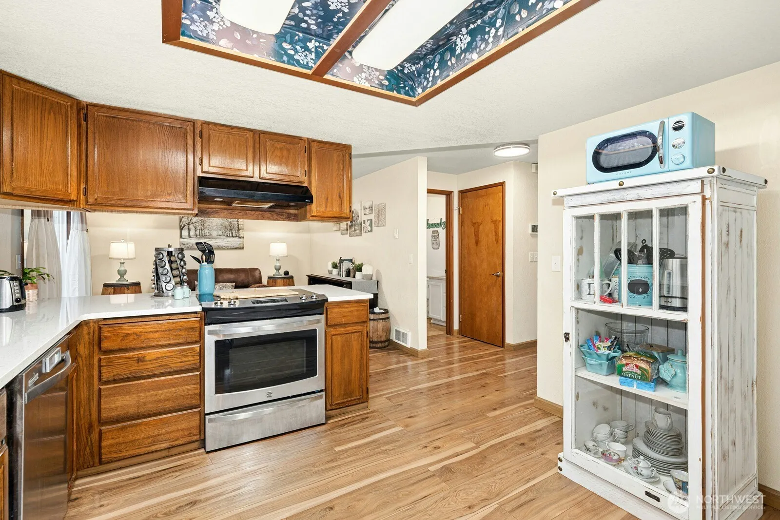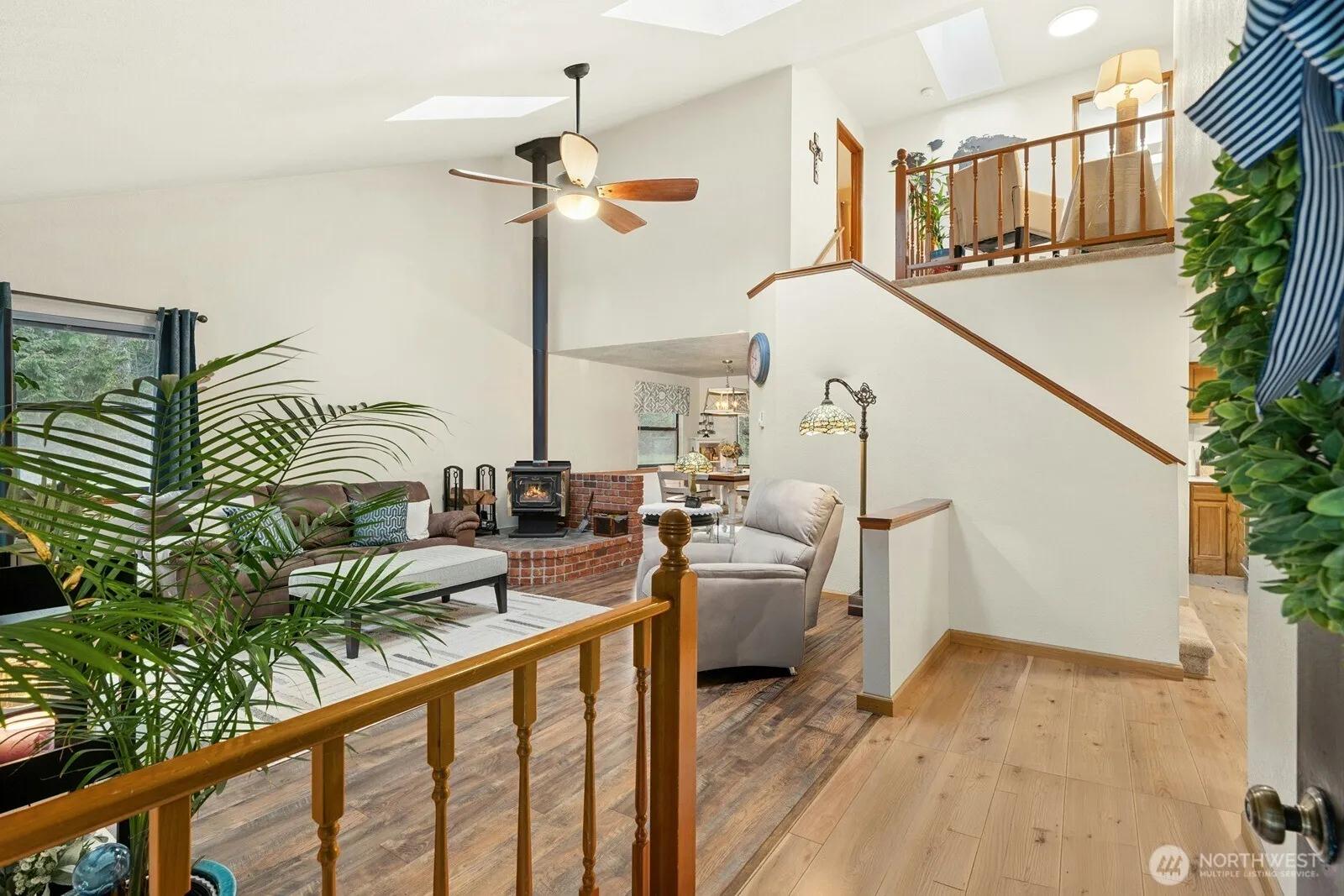 Tucked away in a peaceful, wooded setting, this serene property offers privacy and space on over 1 acre. 4-bedroom, 2.5-bath home designed for the flexibility today’s buyers are looking for. A welcoming covered front porch and soaring ceilings at the entry create an inviting first impression, leading into a functional, well-designed layout. Inside, LVP flooring runs throughout the downstairs, complemented by updated bathrooms and upgraded light fixtures. The layout includes a main-level office/bedroom and great overall flow. The kitchen showcases quartz counters and SS appliances, complemented by bar seating and a dedicated dining room just off the kitchen. It flows seamlessly into comfortable living areas—ideal for everyday living and entertaining. A wood stove adds warmth and character, while abundant storage enhances practicality. Step outside to a patio overlooking a private backyard surrounded by mature trees, creating a peaceful and secluded setting. Cherry, plum, and apple trees, along with berry bushes, add to the charm. The level lot features a privacy fence, large paved driveway, ample parking, RV parking, carport, 1-car garage, and a spacious shed for additional storage. Ideally positioned between Gig Harbor and Port Orchard with quick access to Hwy 16, offering a strong balance of privacy and accessibility. Welcome home!