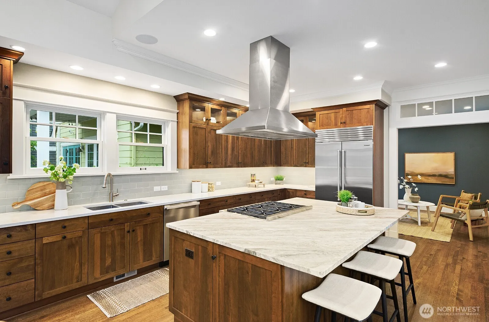 This Green Lake Craftsman is a Masterclass in exquisite design, function, beauty and location! Custom designed home built to the finest specification and detail on a lovely, quiet street. In floor heat and central A/C are throughout the home. Solar panels provide household electricity. Attached 2 car garage has easy alley access and is wired for EV charger. The Main floor features a spacious entry hall, living room w/ gas fireplace, office, dining room, powder room and chef’s kitchen w/ island, breakfast room, Wolf, Subzero and Miele appliances. A main floor Primary suite offers a spacious bath, heated floors, generous built-ins and overlooks the stunning garden, water feature and bluestone patio. The 2nd level offers 3 bedrooms and a full bath. The lower level features an entertainment size family room with wet bar, wall mounted tv, pool table, workout room, art studio, guest room and a 3/4 bath. Abundant storage is found on every level. Professionally designed and landscaped outdoor spaces are an entertainer’s dream! Landscaping includes irrigation and lighting systems, elegant water feature, Bluestone patio, natural gas hookup and grill. Walk to Green Lake and charming Tangletown cafes from this amazing home!