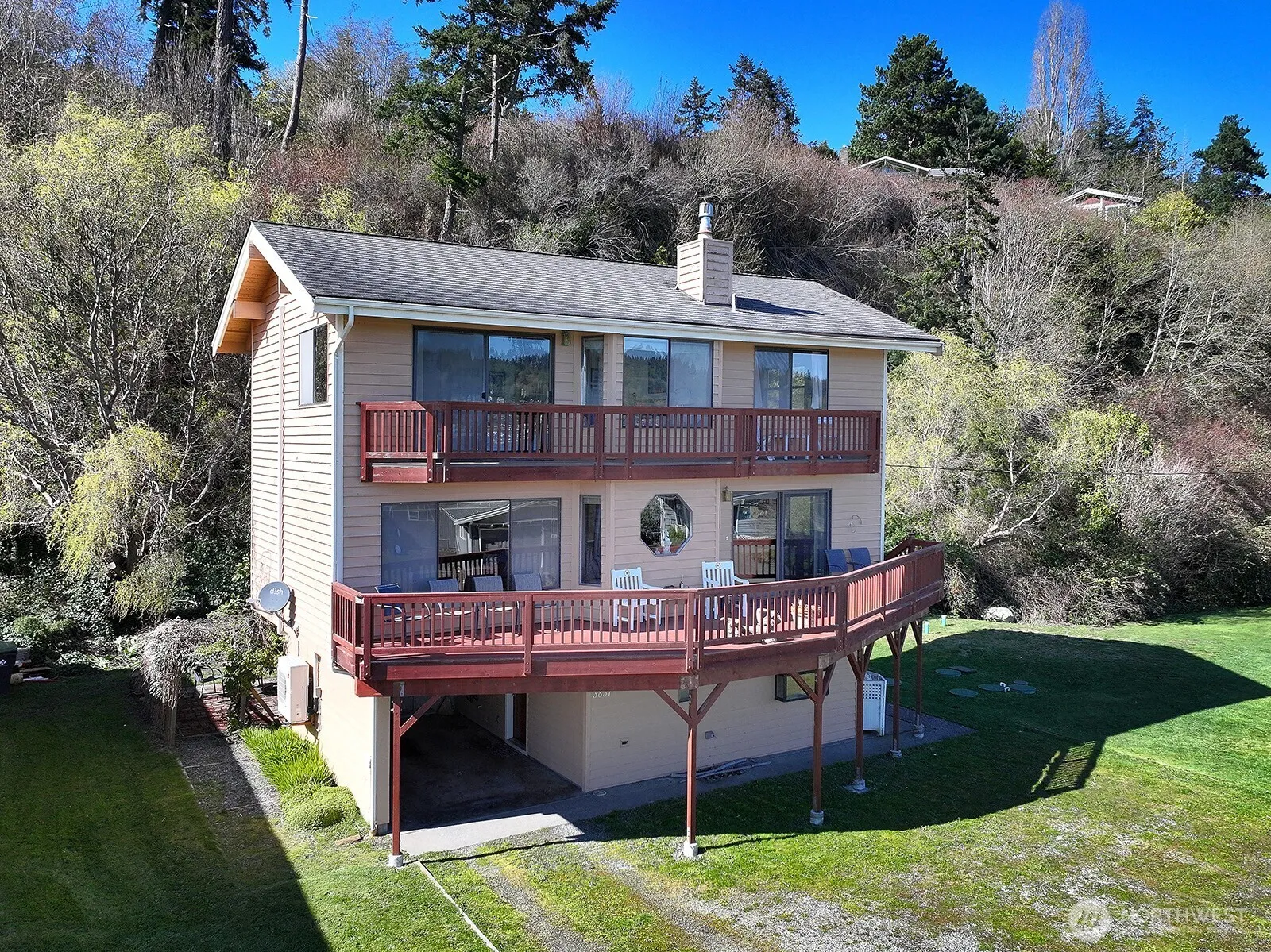 Standing tall and capturing the breathtaking views of the Bay and Mt. Rainer. Enjoy the watercraft activity during the day and the lights across the Bay at night. This is perfect for full-time/part-time living or Airbnb. The lower level includes a multi-purpose room (office or guest room), a 3/4 bath, and a utility room. Take it one level up to the main floor and experience unobstructed waterviews from wall-to-wall windows. T&G ceilings and walls in the living room give you that warm, beachy cabin feel! Non-stop views from the kitchen, dining, and living room. New ductless heating & air installed. Enjoy indoor/outdoor entertaining on the large, refinished deck. The upper level includes two bedrooms. The bathroom has a new tub, a mosaic tile turtle, and tile floors. The primary is large enough to include a sitting area and has access to another refinished deck. The carport now has an EV charger. A new septic system has been installed. To wrap it all up, this is located in a beach community offering a boat launch, a seasonal swimming pool, a clubhouse, an athletic court & playground. Why wait, spring & summer are just around the corner.