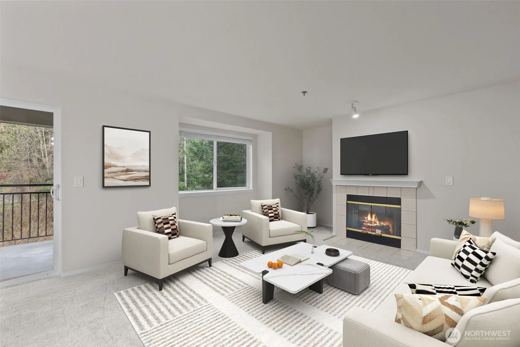 Welcome to this beautifully maintained 2-bedroom, 2-bath condo in the heart of Bothell. Offering thoughtfully designed living space, this light-filled home features an open layout with spacious living and dining areas anchored by a cozy fireplace and large windows overlooking a peaceful, wooded backdrop.The kitchen offers generous cabinetry, ample counter space, and a convenient breakfast bar that opens seamlessly to the main living area. Ideal for entertaining or everyday living. Sliding glass doors extend the living space to a private covered balcony, perfect for year-round enjoyment with tranquil tree-lined views.The primary suite provides privacy and comfort with an en-suite bath and excellent closet space. A well-proportioned second bedroom and full guest bath offer flexibility for visitors, a home office, or additional living needs. Both bathrooms feature updated vanities and clean, modern finishes. A full-size in-unit washer and dryer add everyday convenience.Set within a well-maintained community with dedicated parking and beautifully landscaped grounds, this home offers easy access to downtown Bothell, parks, trails, shopping, dining, and major commuter routes. Comfortable, move-in ready, and ideally located, this is condo living at its best.