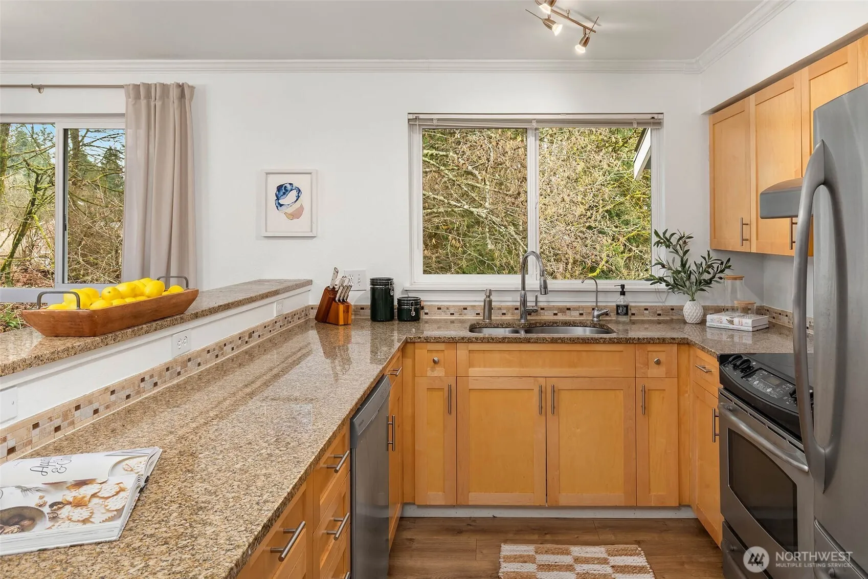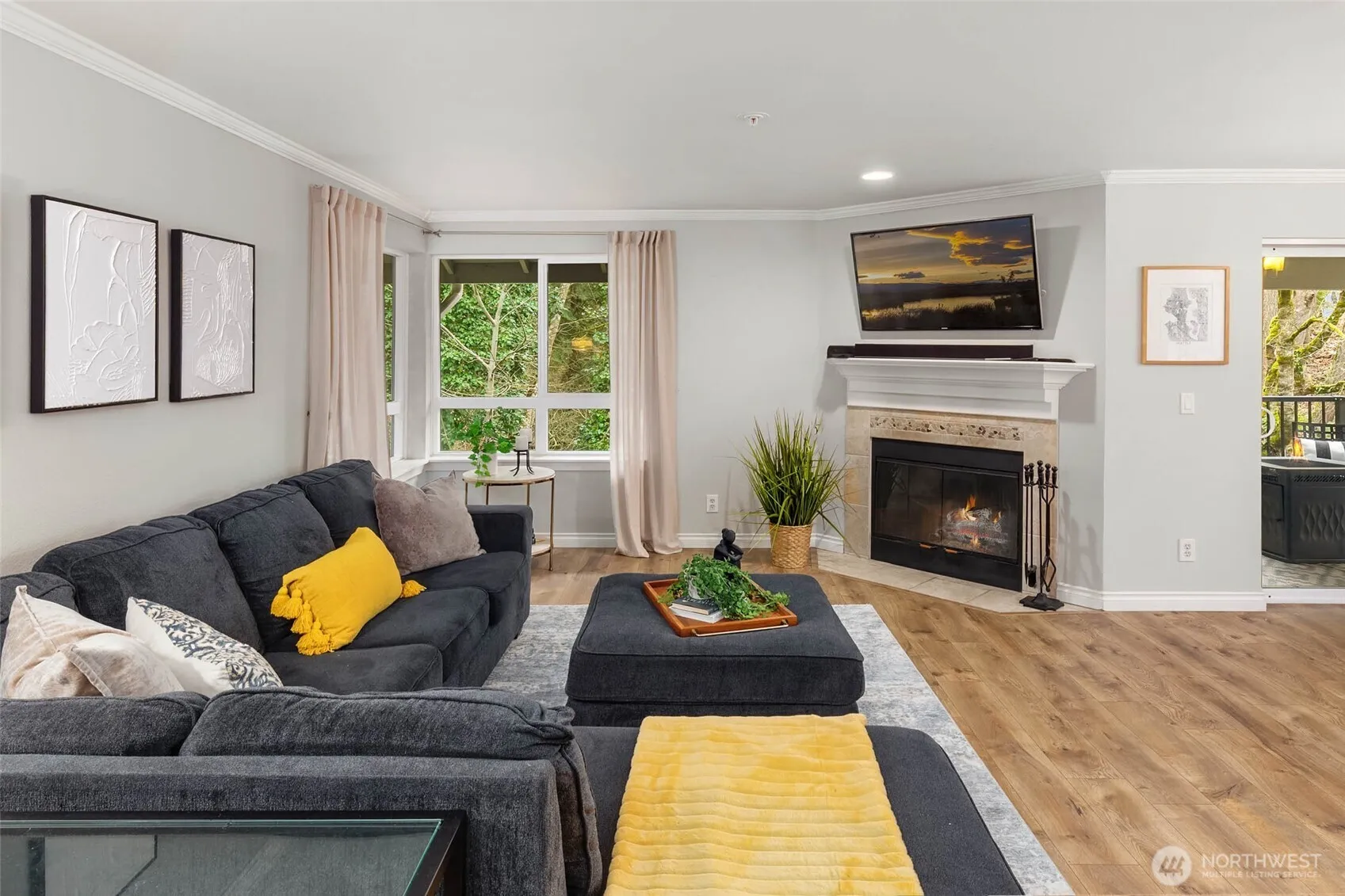 Top-floor corner unit condo in Bothell’s highly desirable Northshore School District! No rental cap! This beautifully updated 2-bedroom home offers privacy, natural light, & an ideal open-concept floorplan. Enjoy west-facing territorial views & vibrant sunsets from the oversized front balcony – perfect for dining al fresco. A second covered patio backs to a protected greenbelt, delivering rare serenity, bird-song mornings, & year-round privacy. Interior features include hardwood floors, crown molding, granite slab countertops, & stainless steel appliances. The spacious kitchen shines with ample cabinet storage, generous counter space, pantry-style organization, & a large eat-up bar for entertaining. Bright living & dining areas are wrapped in windows for abundant natural light. Smart split-bedroom layout with bedrooms on opposite sides for maximum privacy – ideal for guests, work-from-home office, or roommate flexibility. Extra storage throughout plus your own private 1-car garage. Resort-style community amenities include a full fitness center, outdoor pool, & hot tub. Prime commuter location near I-405 and SR-522 with easy access to downtown Bothell, Woodinville, Kirkland, & Redmond, plus shopping, dining, & parks. Move-in ready Bothell condo with luxury finishes, dual patios, sunset views, greenbelt setting, unbeatable convenience. Low-maintenance living with great storage, greenbelt privacy, a sunset balcony, & tons of guest parking makes this Bothell condo a standout.