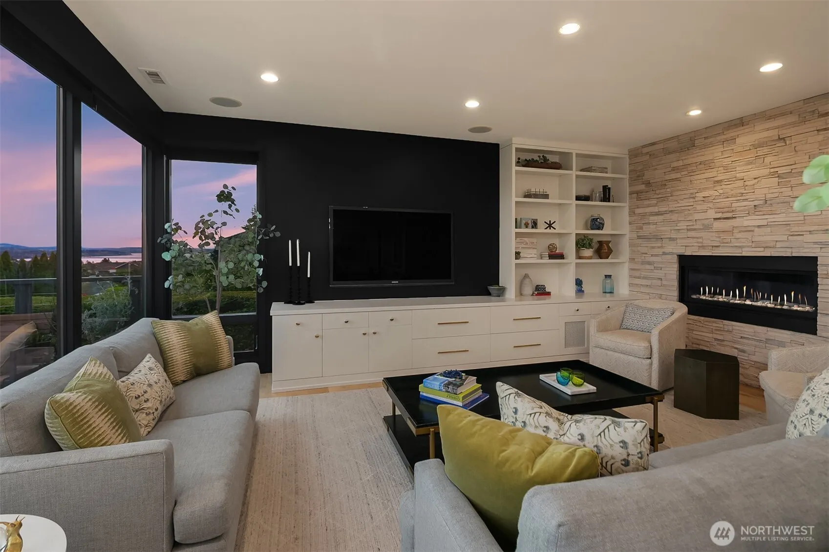 Stunning reimagined wood- and stone-clad modern home with a gracious covered entry and sun-filled interiors designed to capture sweeping views of Lake Washington, the Cascades, and Mount Rainier. Soaring ceilings, open living spaces, and an effortless floor plan create the lifestyle today’s buyers seek. The inviting great room features a stone-surround fireplace, wall of windows, and seamless connection to the spacious deck and open dining area with built-ins. Beautifully appointed chef’s kitchen features a substantial white oak island, painted cabinetry, Quartz countertops, and premium Sub-Zero, Wolf, and Thermador appliances, plus a wine refrigerator. White oak floors, custom lighting, automatic window coverings, and designer fixtures elevate the home throughout. A jewel-box powder room, mudroom with full-height cubbies and workspace, and main-level office add style and function.Upstairs, the spa-inspired primary bath is a true retreat, featuring a soaking tub, dual shower heads, designer finishes, and direct access to the serene primary suite with private view deck. The upper level also includes three generous bedrooms, an additional bath, and a conveniently located laundry room. The daylight lower level offers recreation and media space, gym, fifth bedroom, full bath, and large storage room with exterior access. Enjoy a generous view deck with fire table, covered patio, level yard, plus an oversized two-car garage with dedicated bike area and abundant storage.