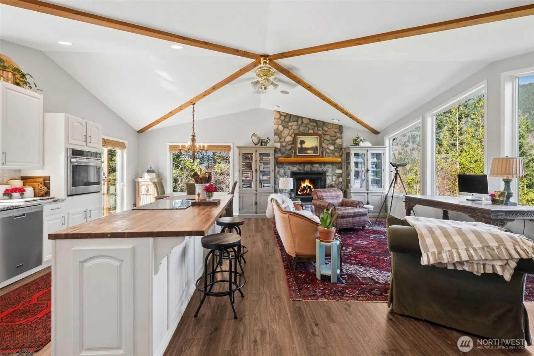 Create the lifestyle you’ve been envisioning—your own private homestead where space, self-sufficiency & natural beauty come together. Awe-inspiring views surround you in every direction! This rare offering includes 2 tax lots totaling 26 acres, ideal for a multi-generational compound, future build potential, or room to expand. Live immersed in the seasonal rhythms —summer gardening in a 40×40 tilled space, biking to the lake, vibrant fall colors, & winters by the wood-burning frplc w/snow-capped mountain views. Decks perfectly positioned for both sunrise & sunset views! Inside, the 3 bdrm, 2.75 bath home blends comfort w/functionality. Vaulted ceilings elevate the great room, while the remodeled kitchen features white cabinets, quartz counters, undermount sink & butcher block island. Durable LVP flooring + new carpet & paint. Primary suite w/walk-in closet & spa-like bath w/self-heated jetted tub, slider to deck. Well-designed for indoor-outdoor living, LL offers a spacious family room w/wood burning stove, 3rd bdrm & bath + separate entrance & 2 car garage. Enjoy access to a private lake shared by just 9 properties. Outbuildings include pole barn w/enclosed workspace, power & ample covered storage + RV parking w/electric/water. Chicken coop too! Second 1-acre parcel features separate well, 2-bdrm septic & electric meter. Generator w/transfer switch, tractor w/6 implements, log splitter & Ford pickup w/plow included to make this property turn-key! In the PBRS KC tax program.
