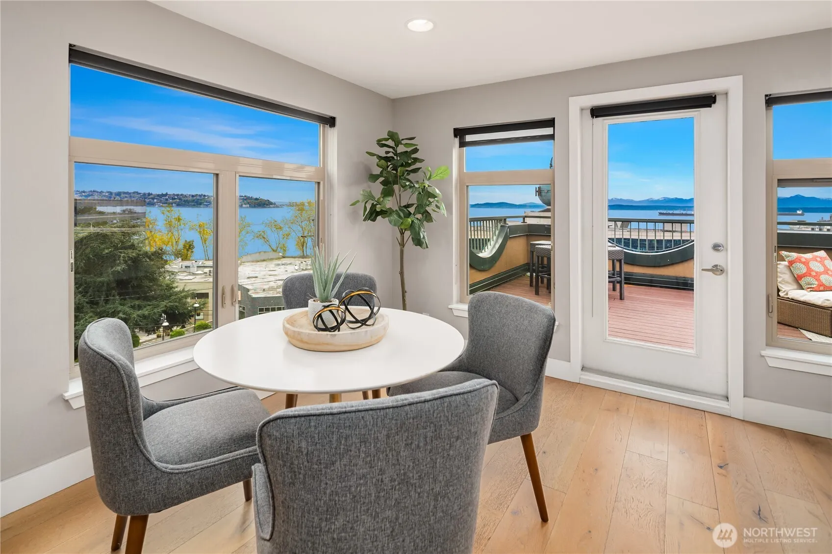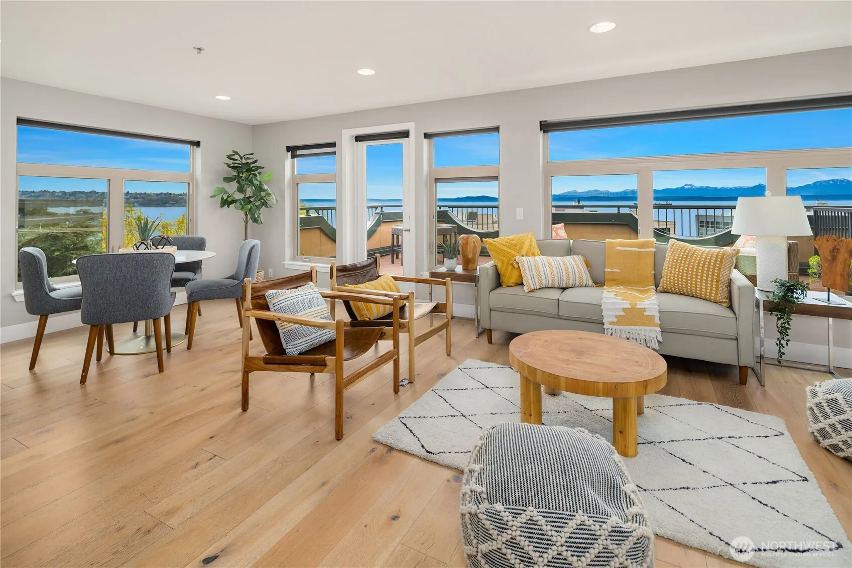 Welcome to Carrara II, an intimate boutique condo ideally situated in the highly sought after Lower Queen Anne neighborhood. This exceptional top floor corner residence offers sweeping views of Puget Sound and the mountains beyond, showcased from nearly every room, along with an expansive private deck of approximately 300 square feet, perfect for taking in the scenery or entertaining.Thoughtfully updated throughout, the home features quartz countertops, wide-plank wood flooring, designer accent lighting, and heated tile floors. The spa-inspired primary bathroom provides a luxurious retreat, complete with a rain shower and illuminated vanity mirror.Residents also enjoy access to a shared rooftop deck, ideal for hosting larger gatherings with stunning city and water views. Additional conveniences include in-unit washer and dryer, secure garage parking with 2 dedicated spaces, and a private storage unit.Located in a vibrant waterfront community, you’ll find world-class dining, lively nightlife, and premier cultural venues just moments away, including McCaw Hall and the newly renovated Climate Pledge Arena. With easy access to Myrtle Edwards Park, Pike Place Market, Seattle Center, and more, this home offers the very best of Seattle living.