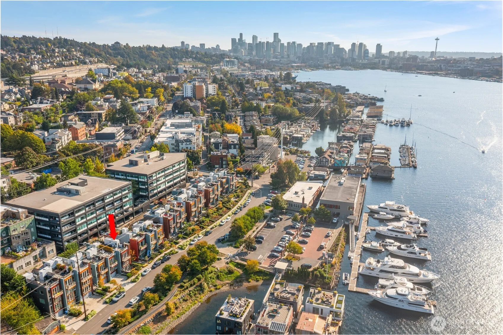 Enjoy seaplanes landing on Lake Union, increasable sweeping views of the lake, and the downtown Seattle skyline. High-end design throughout with over $100,000 in personalized designer upgrades. Truly a wonderful home. A chef’s dream kitchen with a sitting area to share with friends. Commercial-grade appliances including WOLF and SUB-Zero, quartz countertops, large island, and lots of cabinets. The living room enjoys the delightful views and is accentuated by a metal-clad gas fireplace. Next to the custom dining room you will find a climate-controlled glass wine room. Very cool.. On the first floor are two bedrooms, the west facing bedroom features a uniquely private patio. Perfect for those coffee mornings. The primary bedroom features a wall of windows, walk-in closet, and spa-inspired 5-piece bath with heated floors. A genuinely stunning rooftop deck with built-in BBQ and fireplace captures unobstructed views of Lake Union and skyline. A two-car garage, electric blinds and hardwood flooring throughout the home. Owners enjoy access to Ward Cove Marina amenities including moorage, fitness center, bike storage, and guest suite. Perfect for full-time living or a Seattle retreat. Located in one of Seattle’s most vibrant waterfront communities with easy access to downtown, Fremont / University District, Gasworks Park. Very easy commute as well.