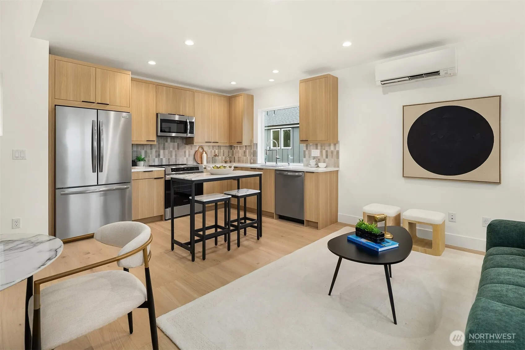 Welcome to Greenlake! This thoughtfully designed two-bedroom home by Moderna Homes sits just blocks from Greenlake Park and Greenwood Avenue, placing the 2.8-mile walking loop, open green space, and year-round recreation right at your doorstep. Everyday conveniences and neighborhood favorites are within easy reach, including Red Mill Burgers, El Chupacabra, and Petit Pierre Bakery. The home is arranged across three distinct levels, offering two private bedroom suites—one on the lower level and one on the upper—while the main floor is dedicated to the kitchen, living, and dining areas. This layout creates a natural separation of space, ideal for privacy, hosting guests, or flexible living. An attached storage shed provides ample room for bikes, gear, and seasonal items, and a designated parking space adds everyday convenience. The chef’s kitchen features high-end appliances, quartz countertops, and modern finishes, complemented by organic textured porcelain tile and warm wood cabinetry that bring depth and an elevated, welcoming feel. A rare opportunity to own new construction in a highly walkable, amenity-rich location where lifestyle and design come together seamlessly.