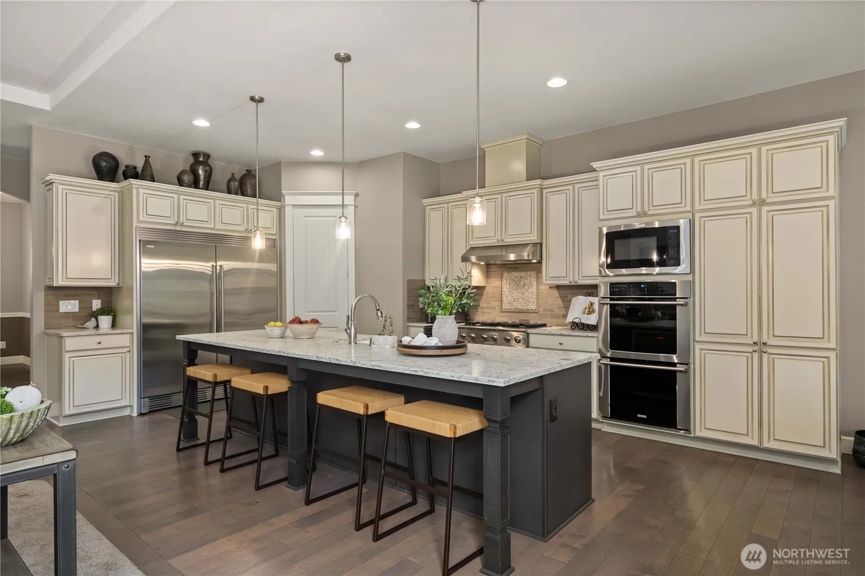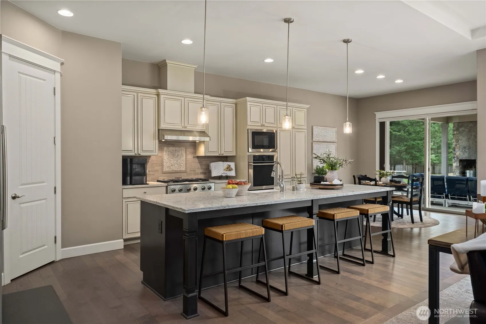 Beyond the gates of Estates at Sugarloaf, this Garrette Custom home unfolds across nearly 3 private acres, offering a rare blend of elevated craftsmanship, resort-caliber outdoor living, and the kind of privacy that feels worlds away. The grounds are nothing short of spectacular, designed for unforgettable entertaining and everyday enjoyment with event-worthy landscaping, a covered outdoor patio with fireplace, heaters, fan, and TV, a fully appointed outdoor kitchen with grill, burners, sink, pizza oven, and refrigerator, a lit sport court, hot tub, tranquil koi pond and waterfall, turf lawn, irrigation, and extensive landscape lighting. The home offers main-floor living with everything you need on the main level, including a beautifully secluded primary suite that feels like a true retreat with a spa-inspired bath and dual-head shower. Soaring 10′ ceilings, 8′ doors, engineered hardwood flooring, heated herringbone tile, and plantation shutters elevate the main level, while the chef’s kitchen serves as the heart of the home with premium Electrolux appliances, dual ovens, a gas cook top, farmhouse sink, quartz counters, and custom built-ins. Upstairs, a spacious bonus level adds exceptional flexibility with a bedroom, full bath, bonus room, and office space, ideal for multi generational living, game nights, work-from-home needs, or long-term guests. Additional amenities include surround sound, central vacuum, whole-house generator, circular drive, and coveted Tahoma Schools.