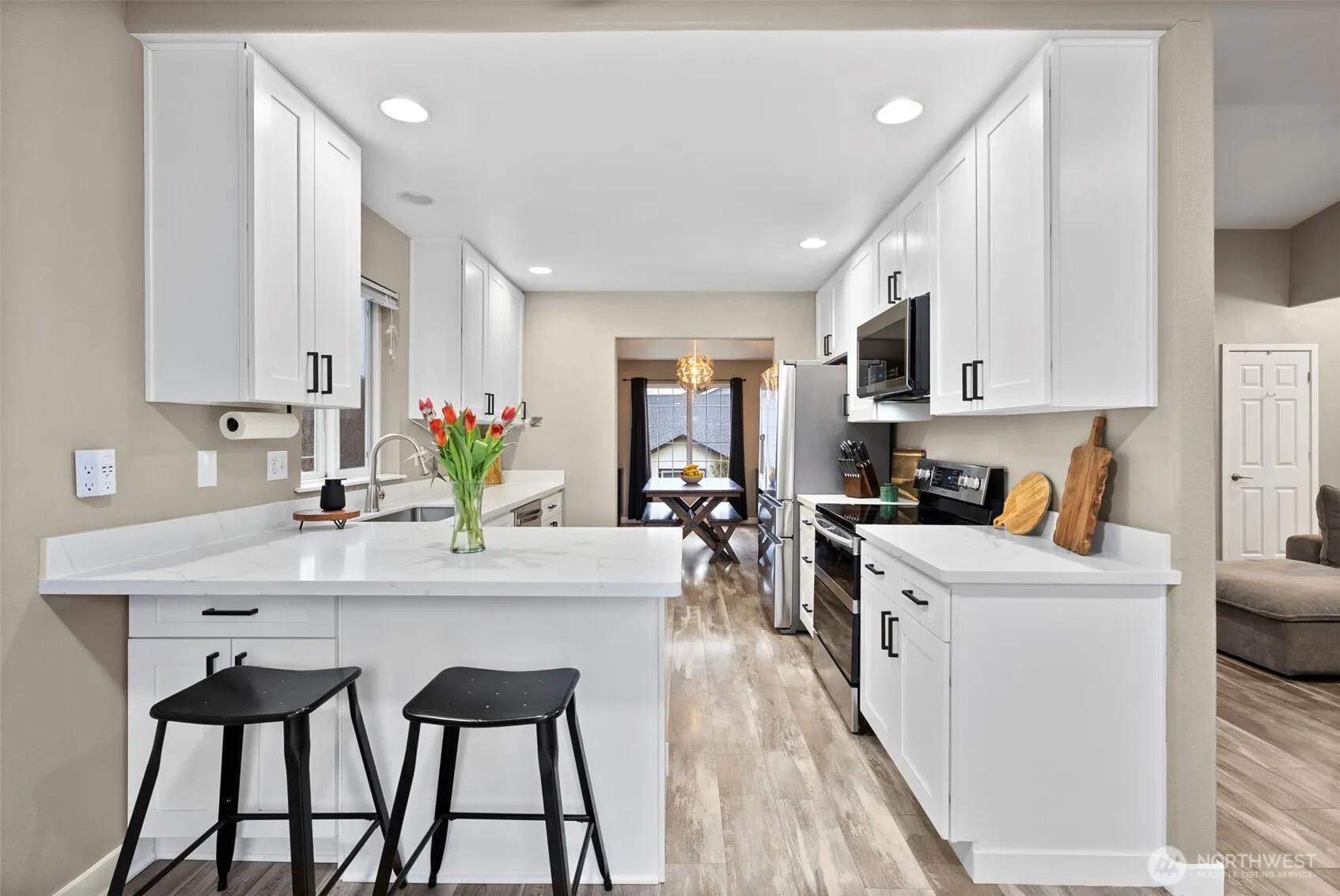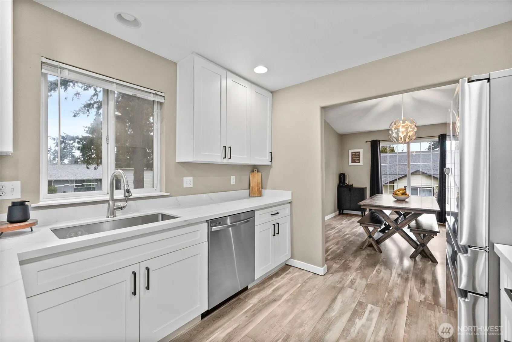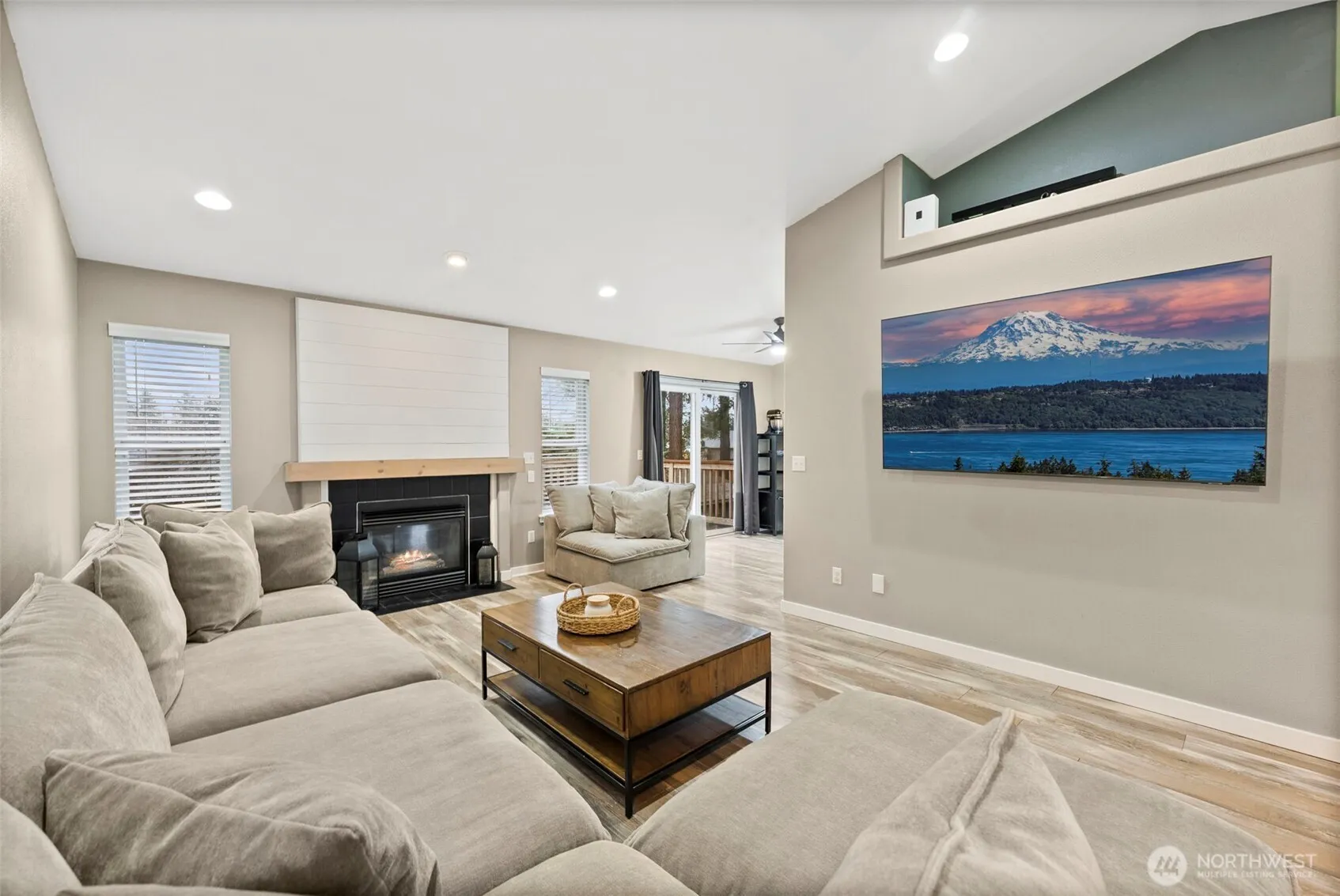 Welcome home to this beautifully refreshed split-level gem in Tacoma! Brand New Roof CHECK! Brand New Exterior Paint CHECK! New HVAC CHECK! New Hotwater tank CHECK again! Vaulted ceilings and a cozy gas fireplace create a warm, inviting living space, while the fully remodeled kitchen shines with white painted cabinets, black hardware, and stunning quartz countertops. With 4 bedrooms and 3 baths, this home offers flexibility for modern living. The main level flows to a spacious deck, and the lower level features a large recroom, covered patio, and private bedroom. The primary suite includes its own bath and walk-in closet. Down stairs you will find a super cute “Harry Potter” style playroom/nook adding more charm, and the oversized garage with workshop space in the back is a rare bonus. The stylish updates throughout—truly move-in ready. Extra Long driveway for abundant parking space & extra storage/workshop in the garage.