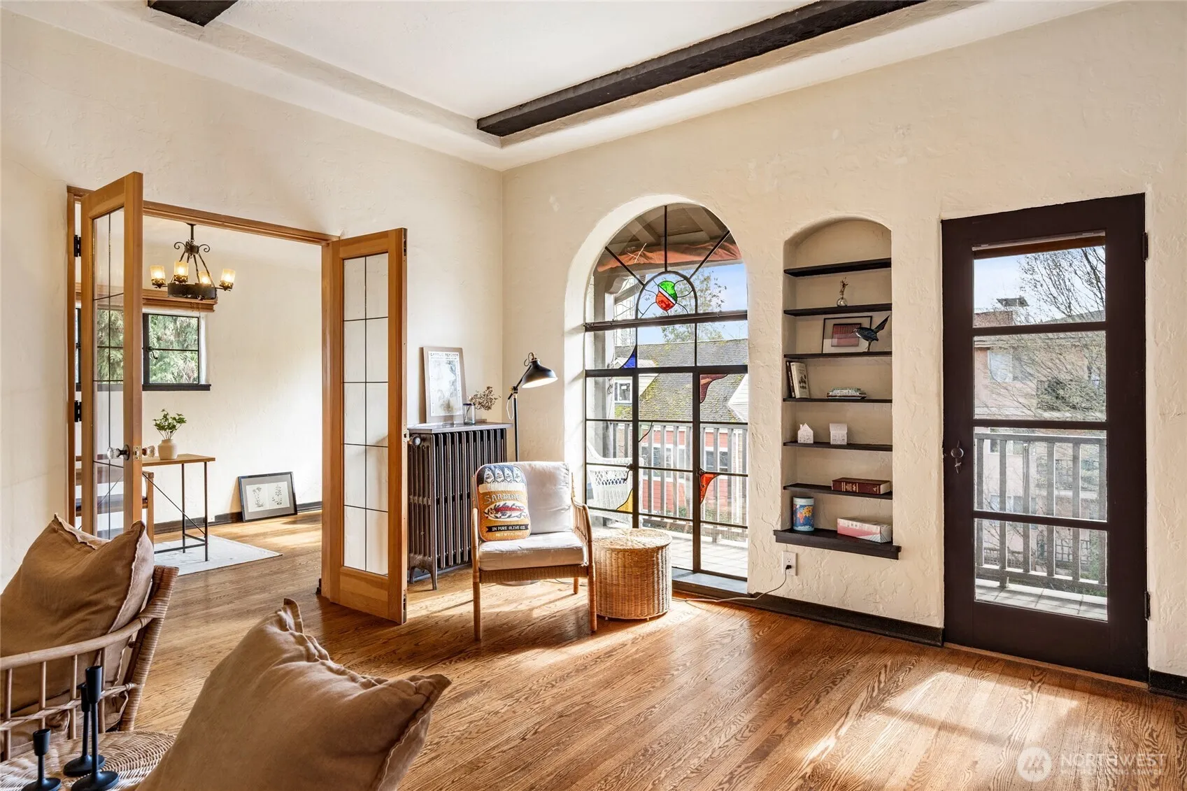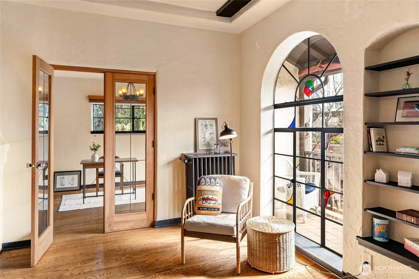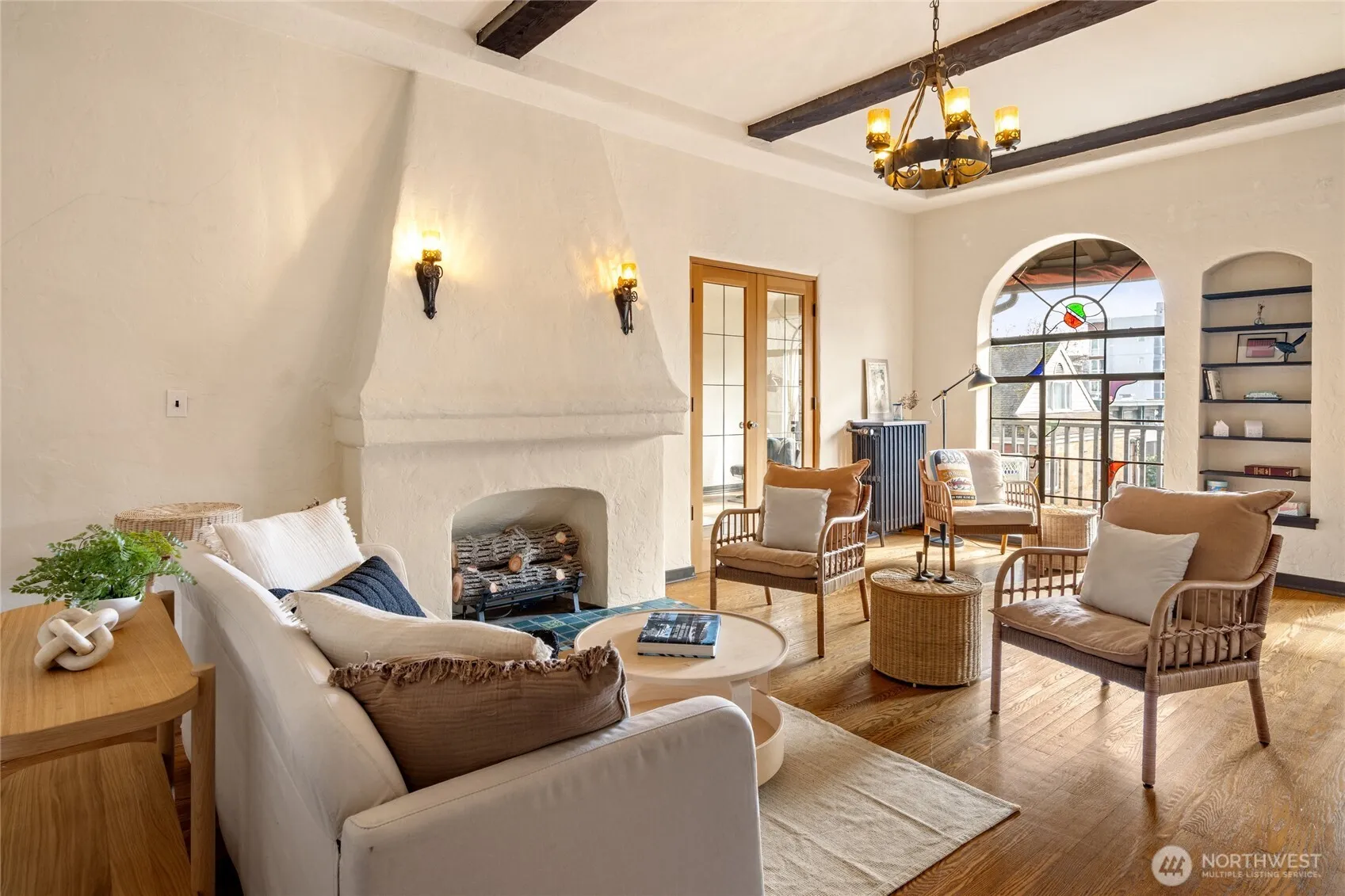 Step into the romance of Spanish Colonial Revival design in this top-floor, end unit, where historic detail meets everyday ease. Sunlight pours into the inviting living room, anchored by a beautiful fireplace, while coved ceilings and archways create a sense of timeless elegance. The updated kitchen honors the home’s character, and a flexible front room adapts to your lifestyle—office, dining, or guest space. Tucked away, the rear bedroom offers peaceful privacy. With garden surroundings, a quiet top-floor setting, and a rare small car garage, this home is both inspiring and livable—just as it has been for generations of artists and writers.