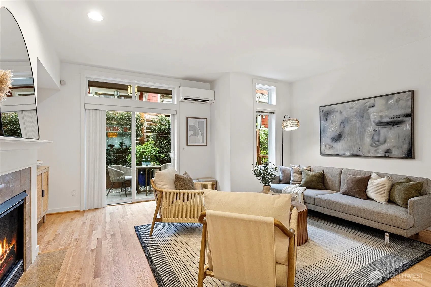 Stylish and convenient living awaits in Ravenna! This far from ordinary townhome sits protected in a sweet community of townhomes that once housed Saxe Nursery. The beautiful landscaping throughout is a nod to that piece of Seattle history! Freshly refinished oak hardwoods on the main which also features a beautiful kitchen with new Taj Mahal quartz countertops and backsplash, and new GE Profile stainless fridge, dishwasher & gas range! Long bar adds additional informal seating if desired. The dining room lets in light through the extra large windows and has ample space for entertaining. Living room has a gas fireplace and mantle surround, slider to a beautiful fenced patio with mature plants for added privacy. Half bath on the main is a bonus. Upstairs features two large bedrooms with vaulted ceilings, both with walk-in closets and en-suite baths. Mini-splits on second and third floors will keep it cool in the summers, and warm in the other months. Freshly painted inside, with new carpeting and designer lighting throughout. Exterior painted and roof replaced in 2025. HOA covers landscaping & sprinklers. Tandem garage accommodates two cars, the tankless hot water tank and lots of storage. Become a regular at the wonderful local hot spots like Bagel Oasis, Third Place Books, Zary Bakery, and Kricket Club. Close to U Village, UW, Seattle Children’s, UW Medical Center, Roosevelt Light Rail Station, Green Lake Park, Burke Gilman Trail, Magnuson Park and much more.