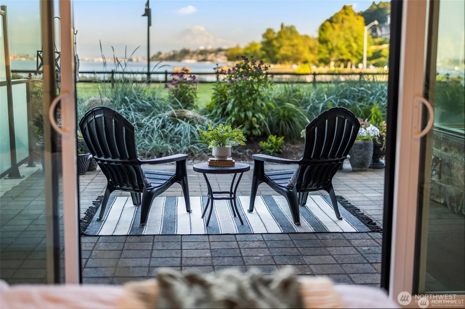 Indulge in luxury Pacific Northwest living with this elegant, freshly painted garden-level 2BR + den, 2BA condo in the heart of dynamic Point Ruston. Furnishings are negotiable. Showcasing breathtaking views of Mt. Rainier and the Puget Sound, this professionally designed residence features soaring 9’ ceilings, a sleek linear fireplace, and an exquisite chef’s kitchen with Quartz waterfall counters and high-end Bosch appliances. The spa-inspired primary suite offers a walk-in closet and radiant heated floors for year-round comfort. Automated Bali window coverings, a versatile den ideal for a home office or guest space, and a spacious laundry room add everyday functionality. Two secure garage parking spots with a storage room provide convenience and peace of mind. LID paid, and three years remain on the valuable tax abatement—an exceptional opportunity to enjoy the vibrant Point Ruston waterfront lifestyle with dining, shopping, trails, and waterfront access just steps away.
