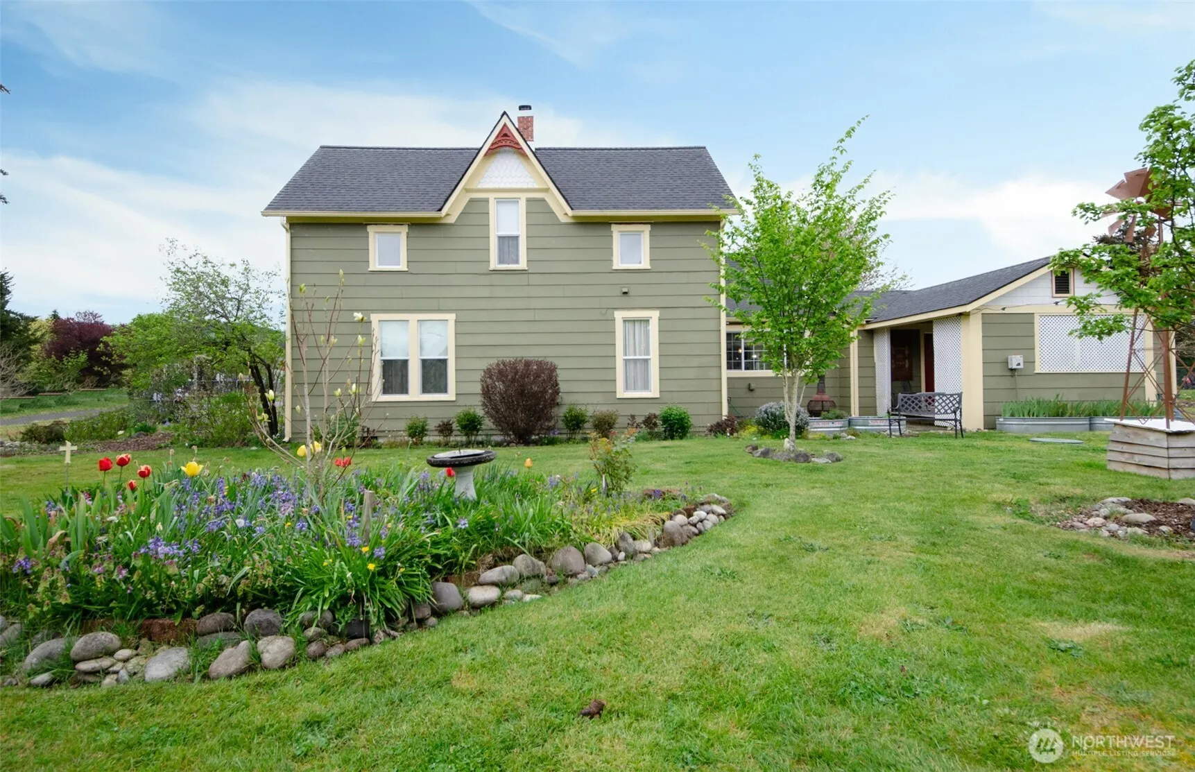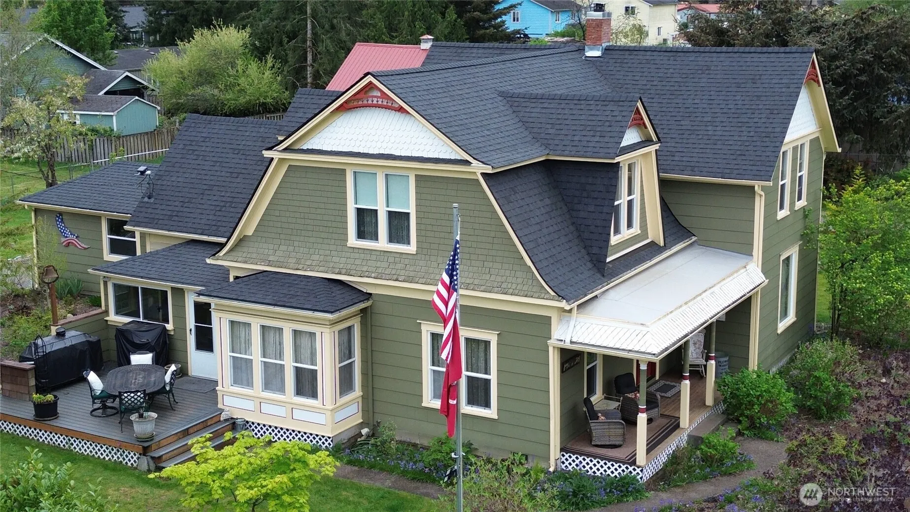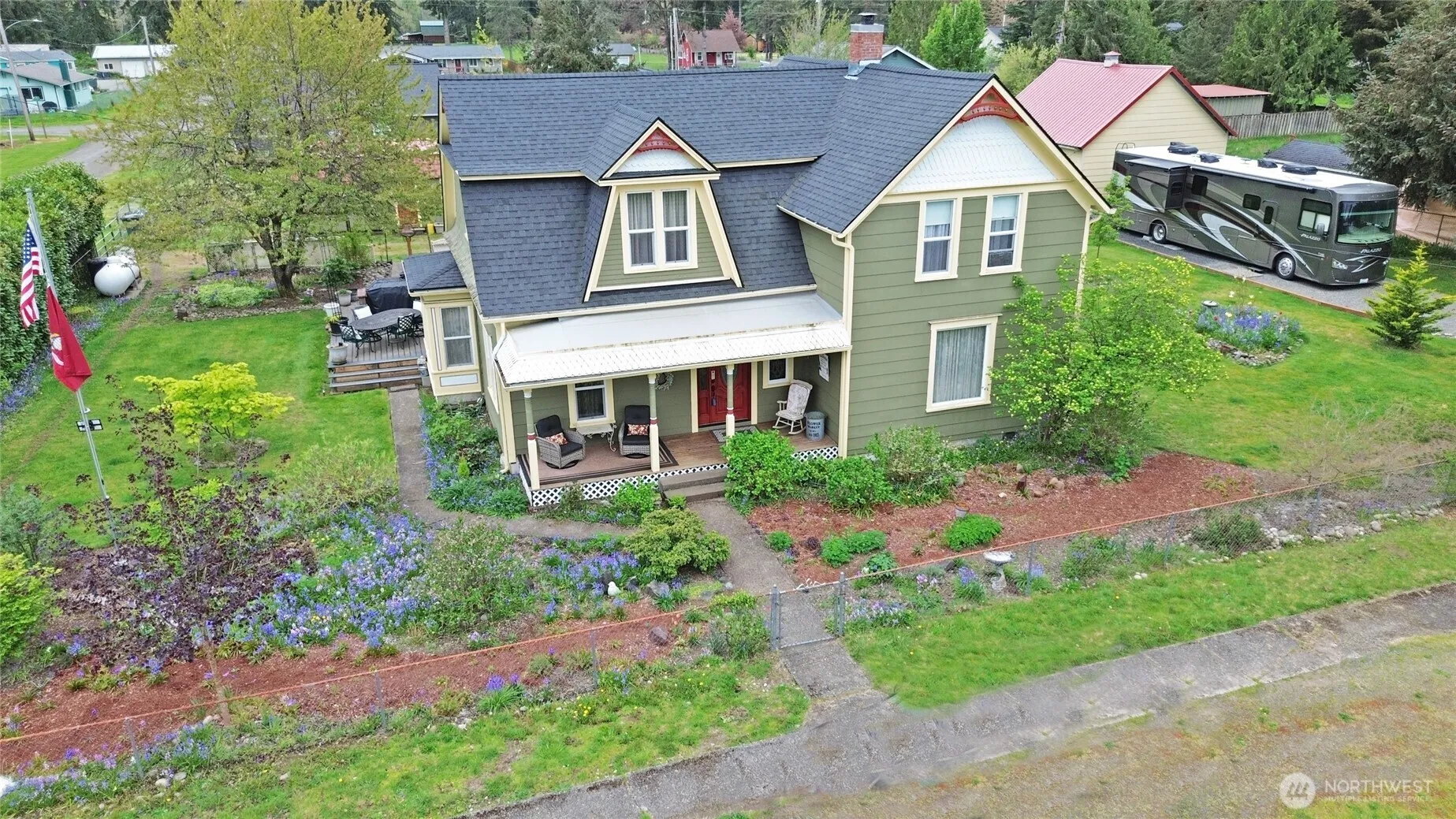 Stunningly restored early-century Dutch-Colonial Revival 2-story home blends historic charm with top-of-the-line modern convenience. The main floor welcomes guests with an elegant entry, parlor, living room and library. Chef’s kitchen features a deep pot filler sink, double ovens, gas range, island with seating and prep sink, plus a cozy breakfast nook. Two stairways add function and character. Main bath boasts a sealed Schluter-System floor and custom tile walk-in rain shower. Utility and craft rooms included. Upstairs offers 3 bedrooms plus den/bonus room and a full bath with clawfoot tub, separate shower, antique cabinet sink, and private water closet. Environmentally-friendly wall heaters. Enjoy an enclosed porch off the kitchen, covered porch off the laundry, concrete patio sitting area, Trex BBQ deck with plumbed propane hookup and power. Historic carriage house has electricity, plus a 12×20 shed with potting sinks, water, and power. Fully fenced with two RV gates, 30-amp service, and water hookup. Easy yard maintenance with manual in-ground watering system. New roof installed in 2024 and outfitted with durable Hardi-Plank siding. Located in a charming small town with an affordable cost of living, conveniently between Seattle and Portland.