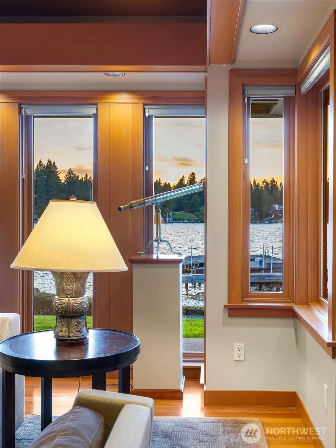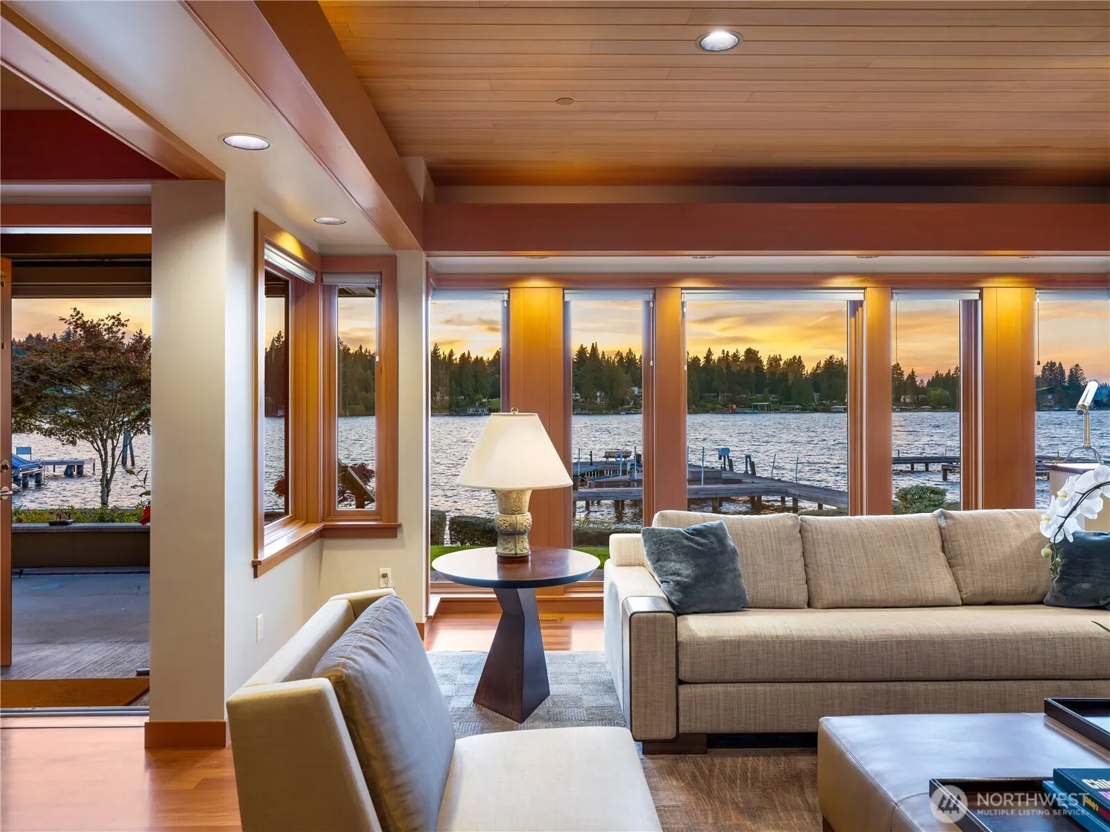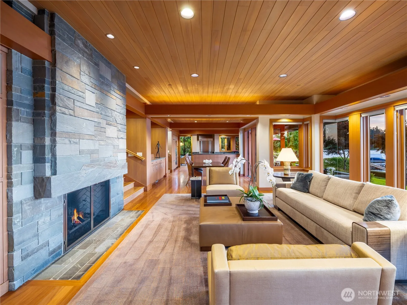 Perfectly balanced. Perfectly serene. Tucked away at the very end of a quiet lane, this 2003 AIA architect-designed home exemplifies Pacific NW waterfront living at its finest. Walls of west-facing windows frame sweeping lake views. Hardwood floors glow beneath paneled hemlock ceilings. Primary view suite includes study with fireplace. Living areas open seamlessly to a trellised terrace which steps down to an expansive gently sloping lawn. 100 plus feet of private, low-bank shoreline with easy to access, pebbled beach. Oversized shared dock with boat lifts complete the experience.Thoughtful design, enduring quality + understated elegance, this residence embodies quiet luxury.A blissfully private sanctuary in harmony with its verdant setting