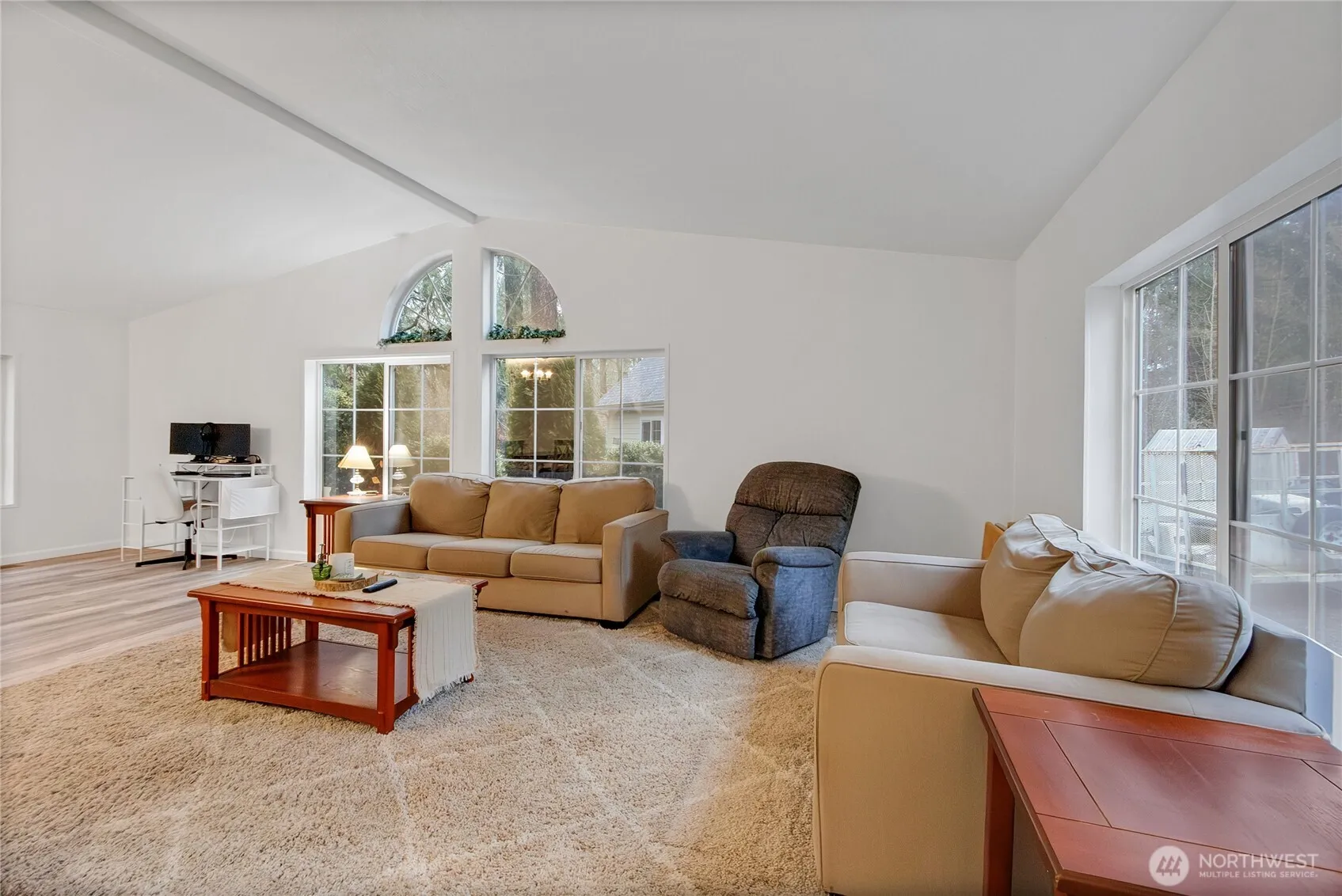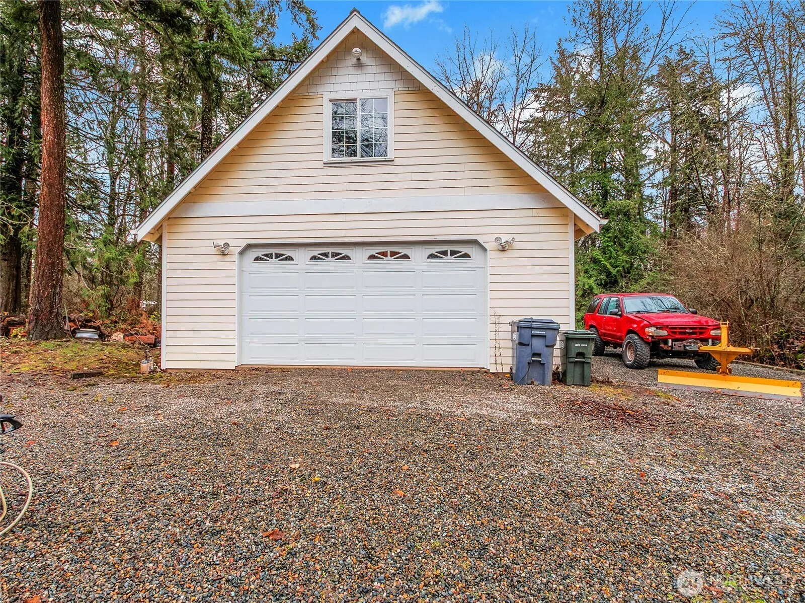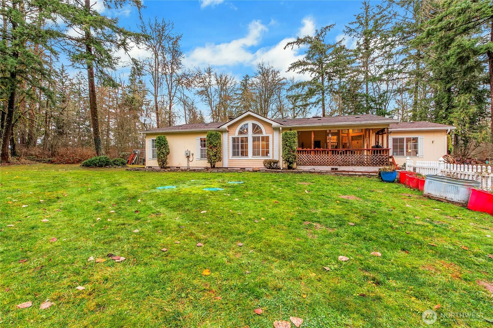 This spacious 2,241 sq ft home sitting on just over 5 acres, offers a very open floor plan with 3 bedrooms &2 bathrooms, including a generous primary suite with a walk-in closet and 5-piece bath. Enjoy multiple living spaces, a bright, open living room, a large dining area plus kitchen with eating area, and a cozy family room with a wood-burning fireplace and French doors leading to the patio. Waterproof laminate flooring throughout, a detached 2-car garage with loft space. The home is wired for generator. The property sits on just over 5 acres with plenty of room for gardening. A brand-new septic system in 2021, and a private well. Relax and take in the surrounding wildlife from the concrete back patio or unwind on the covered front porch.