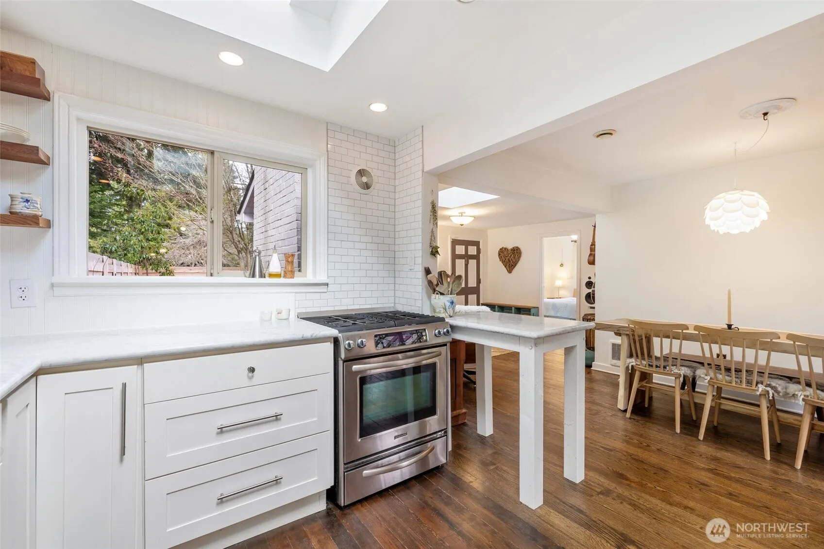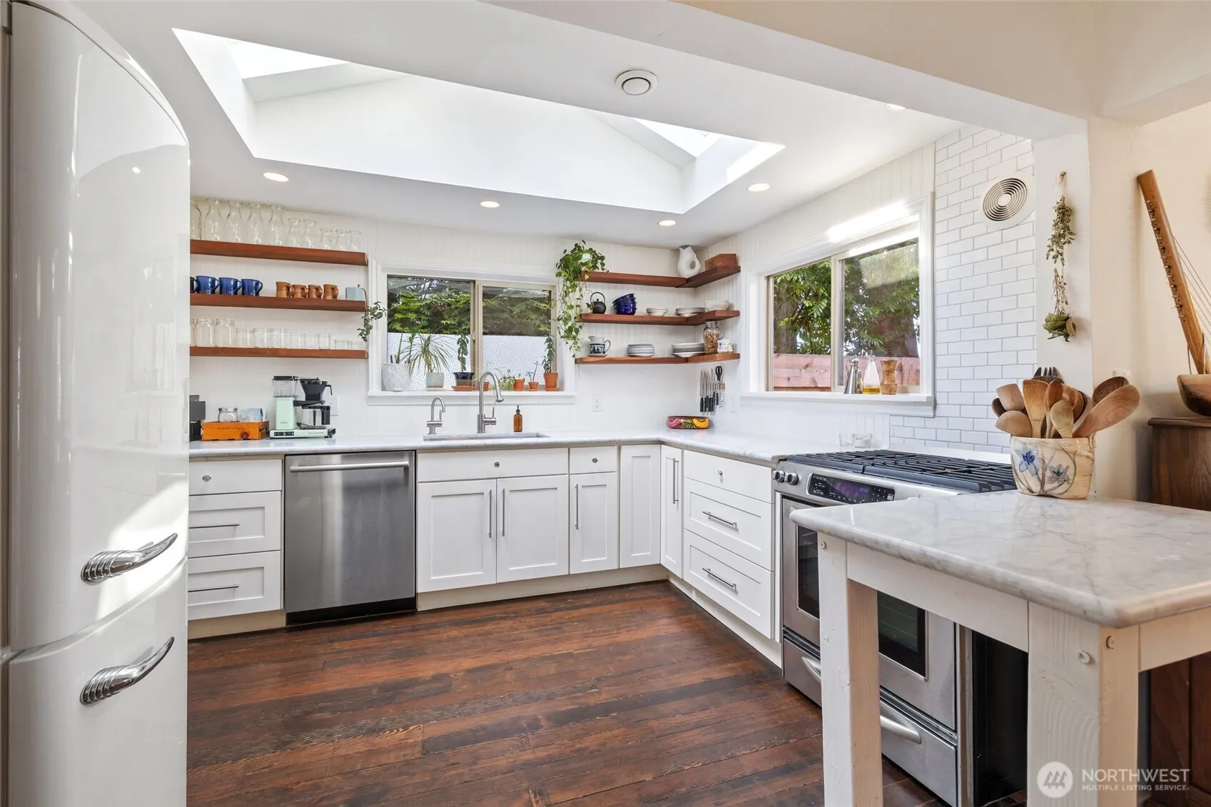 Enjoy daily moments of nature & serenity in this charming bungalow, just steps to Yost Park & minutes to Edmonds waterfront. Bright, inviting layout with thoughtful updates & exceptional privacy. Beautiful kitchen w/ marble counters, soft close maple cabinets, redwood shelves & a classic retro fridge. Remodeled bath w/ deep soaking tub, premium fixtures, floor to ceiling subway tiles & heated floor. New roof, skylights, gutters, extra-thick insulation (2022). New washer/dryer, fence & 10ft gate (2024). You’ll love the generous flex space off the kitchen serving as walk-in pantry, laundry room & mudroom. Outdoor living shines w/ 360sf covered patio, 6-person dry barrel sauna & ample space to garden, play or entertain. A truly special place!