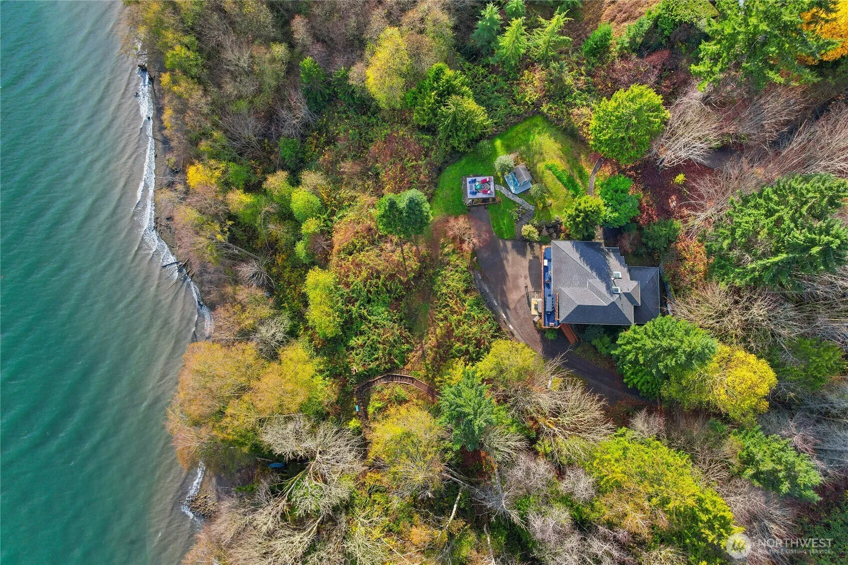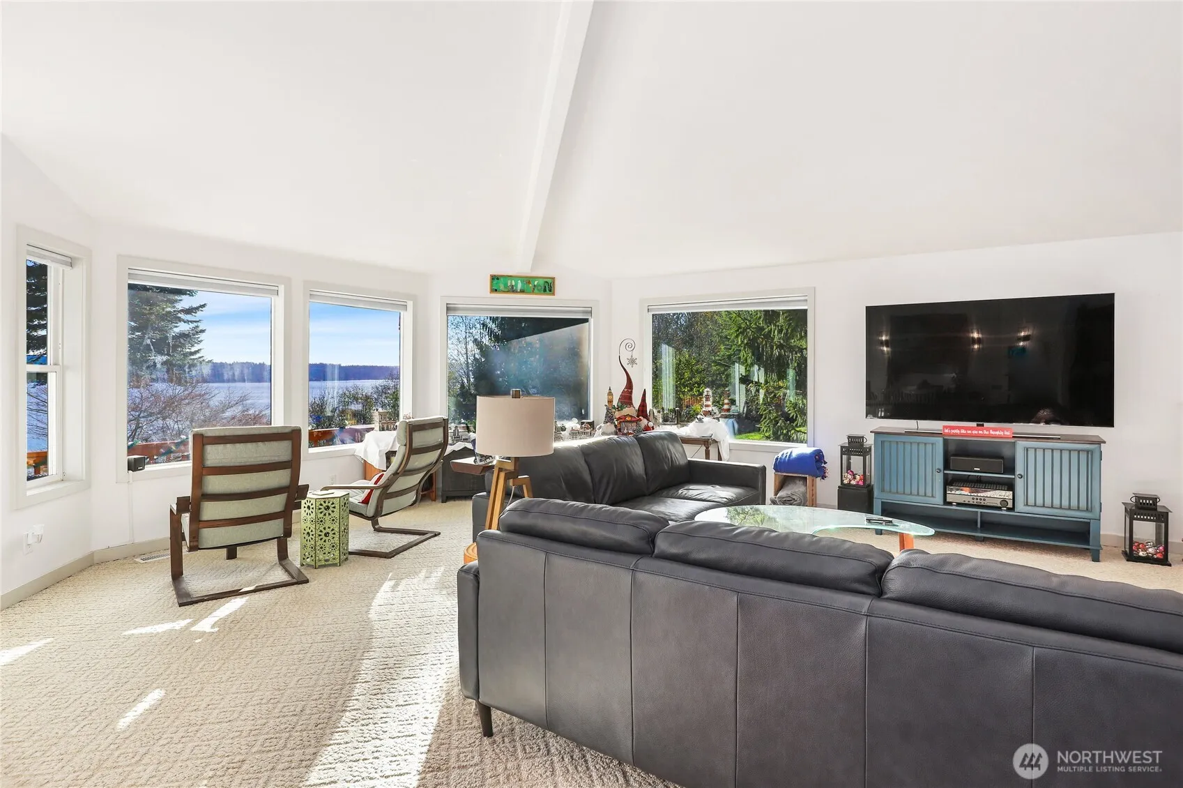 Experience breathtaking water and mountain views from this highbank waterfront retreat with private beach access just steps away. Custom built in 1993, the home offers an open main living area with expansive wall-to-wall windows that bring in abundant natural light. The inviting eat-in kitchen opens directly to the main deck, creating a seamless indoor and outdoor flow. Two comfortable bedrooms and a well-appointed bath complete the main level. Upstairs, the spacious primary suite features large windows, a luxurious five-piece ensuite, a generous walk-in closet, and a private deck. The daylight lower level adds flexibility with large bedroom, exterior entry, laundry and mechanical area, plus oversized walk-in storage. RV + EV power hookups.