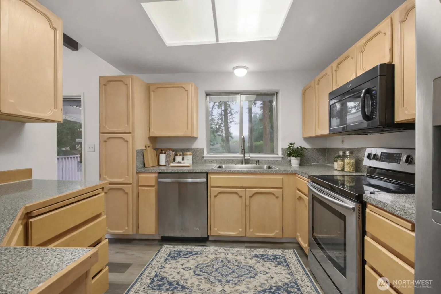 Beautifully maintained split-level home offering nearly 2,300 sqft just minutes from JBLM. Recent upgrades include a newer roof, fresh interior/exterior paint, and new vinyl plank flooring.The upper level features 3 bedrooms, a bright living room, dining area, updated kitchen, and a spacious covered deck. Downstairs offers 2 additional bedrooms, a 3/4 bath, large family room, and versatile rec room—perfect for entertaining, a home gym, or guest space. An oversized 550 sqft garage with high ceilings provides excellent storage or workshop potential.