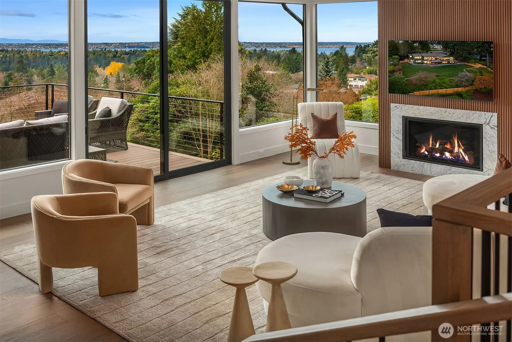 Signature Clyde Hill residence boasts breathtaking panoramic views at the pinnacle of the coveted Aqua Vista community. This exquisite property has been completely reimagined with a whole-house luxury remodel by acclaimed local builder Gerry Homes. Walls of glass frame unrivaled views, illuminating a home loaded with sophisticated fixtures & bespoke finishes that embody a sense of timeless elegance. The sundrenched interior offers open concept living spaces designed for effortless entertaining including a chef’s epicurean kitchen with massive slabs of Carrera marble, custom cabinetry & a luxury Subzero/Wolf appliance package. The sumptuous primary suite is conveniently located on the main level, providing a seamless transition from public entertainment spaces to private living quarters. The expansive lower level provides 4 additional bedrooms including a luxurious guest suite, home gym/flex room & large bonus room perfect for informal gatherings. Expertly sited at the peak of a large 20,000+ SF lot, this one-of-a-kind residence features the rare combination of exceptional privacy and unrivaled westerly views including sweeping vistas of Lake WA, the Seattle skyline, Husky Stadium, the Olympic Mountains & breathtaking sunsets. Incredible location just blocks from the award-winning Clyde Hill Elementary School, mins from vibrant downtown Bellevue, with easy access to SR-520 & Seattle… A truly rare offering for the discerning luxury buyer searching for that “Forever” view home!