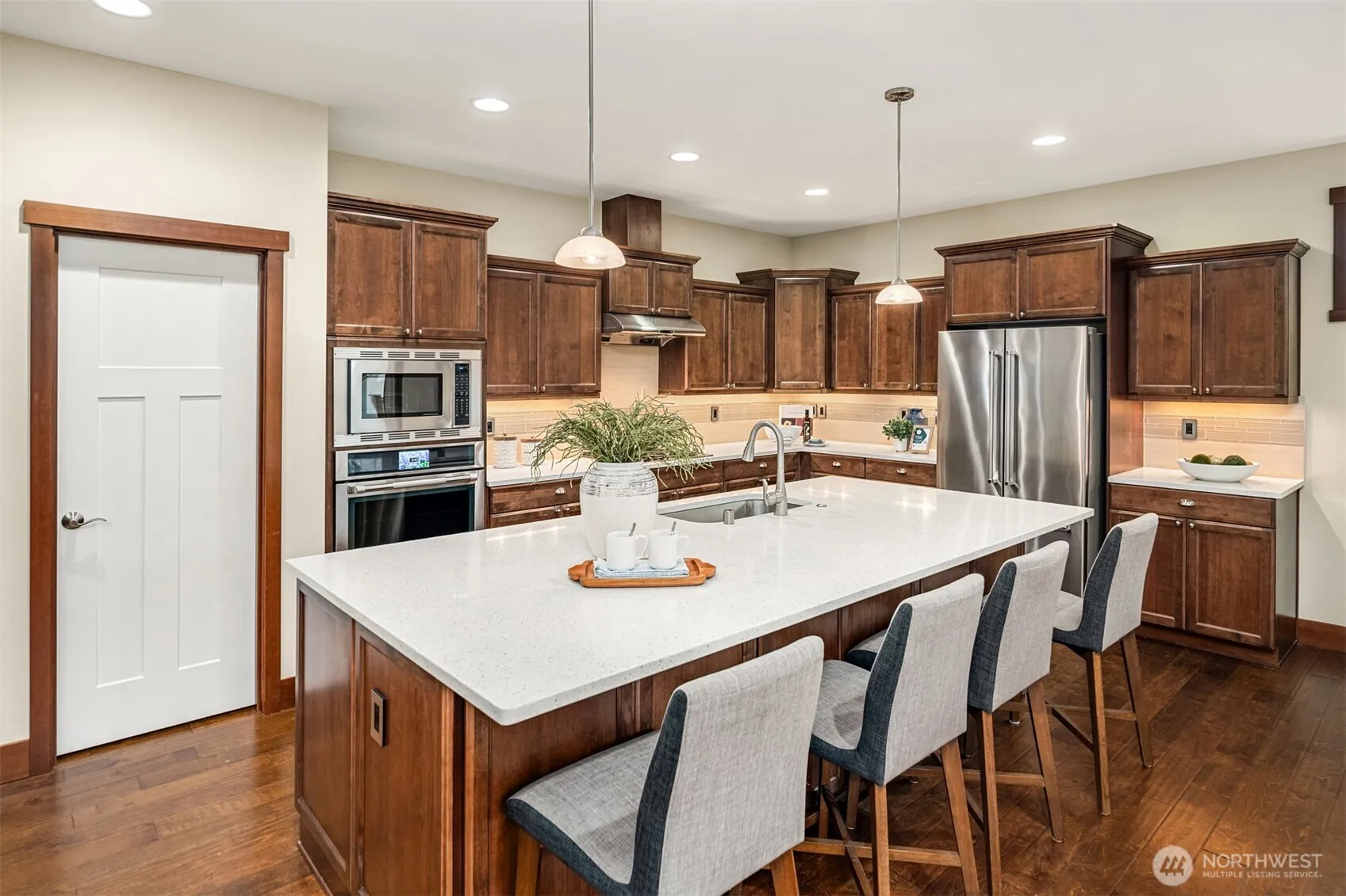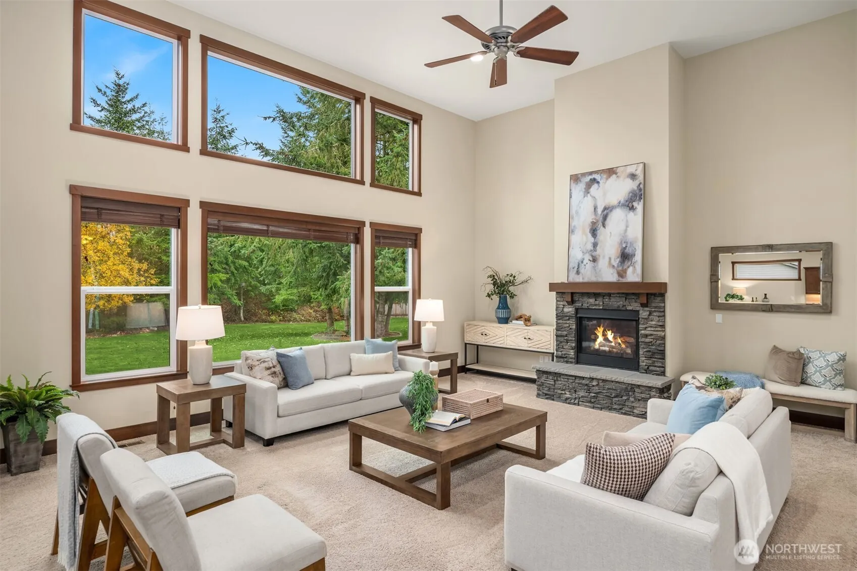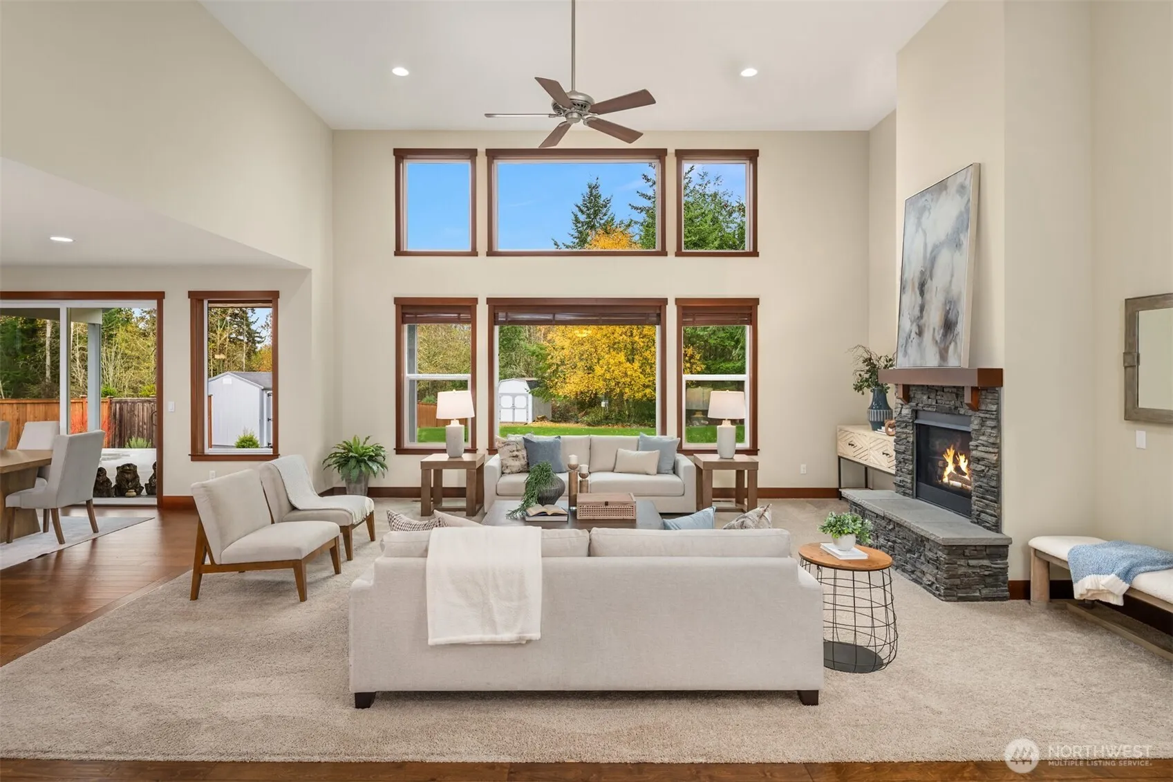 Welcome to serene country living adorned in modern comfort in the Wildridge Community of Stanwood. Live large in this thoughtfully designed rambler with soaring 15′ ceilings and large picture windows though out to amplify natural light. Entertain effortlessly in the open great room and chef’s kitchen featuring a large island, walk-in pantry and a professional BlueStar cooktop. Two bedrooms plus den is found on one side of the home while the a peaceful primary suite has it’s own side of the home. 3 car attached garage plus detached, fully finished garage with heat & AC with attached shop, plus an RV pad with full hookups (electric, water, sewer dump) that fits a 45’ RV! All within minutes to shopping, entertainment and outdoor activities.