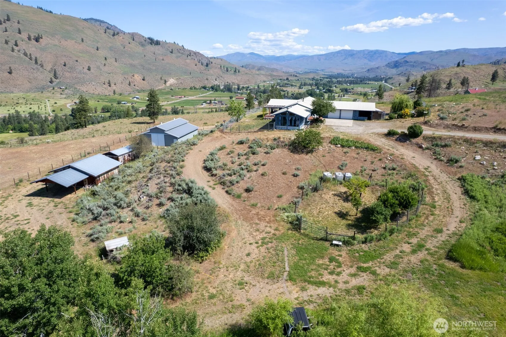 Experience this unique 3-bedroom, 2-bath home set on over 20 acres of stunning Methow Valley views. The property features a year-round sunroom and an expansive wrap-around deck, ideal for enjoying the fresh air during spring and summer. Multiple wood stoves add warmth and coziness for autumn and winter months. Horse ready property, includes a recently updated barn with 6 stalls, a tack room, and modern amenities. You’ll also find two fenced pastures, a fenced backyard, and a spacious shop. Explore the beautiful landscape, which includes a large pond, variety of fruit trees, and picturesque views of the Methow River and North Cascades, all conveniently located close to public land for your outdoor adventures. Schedule your visit today.