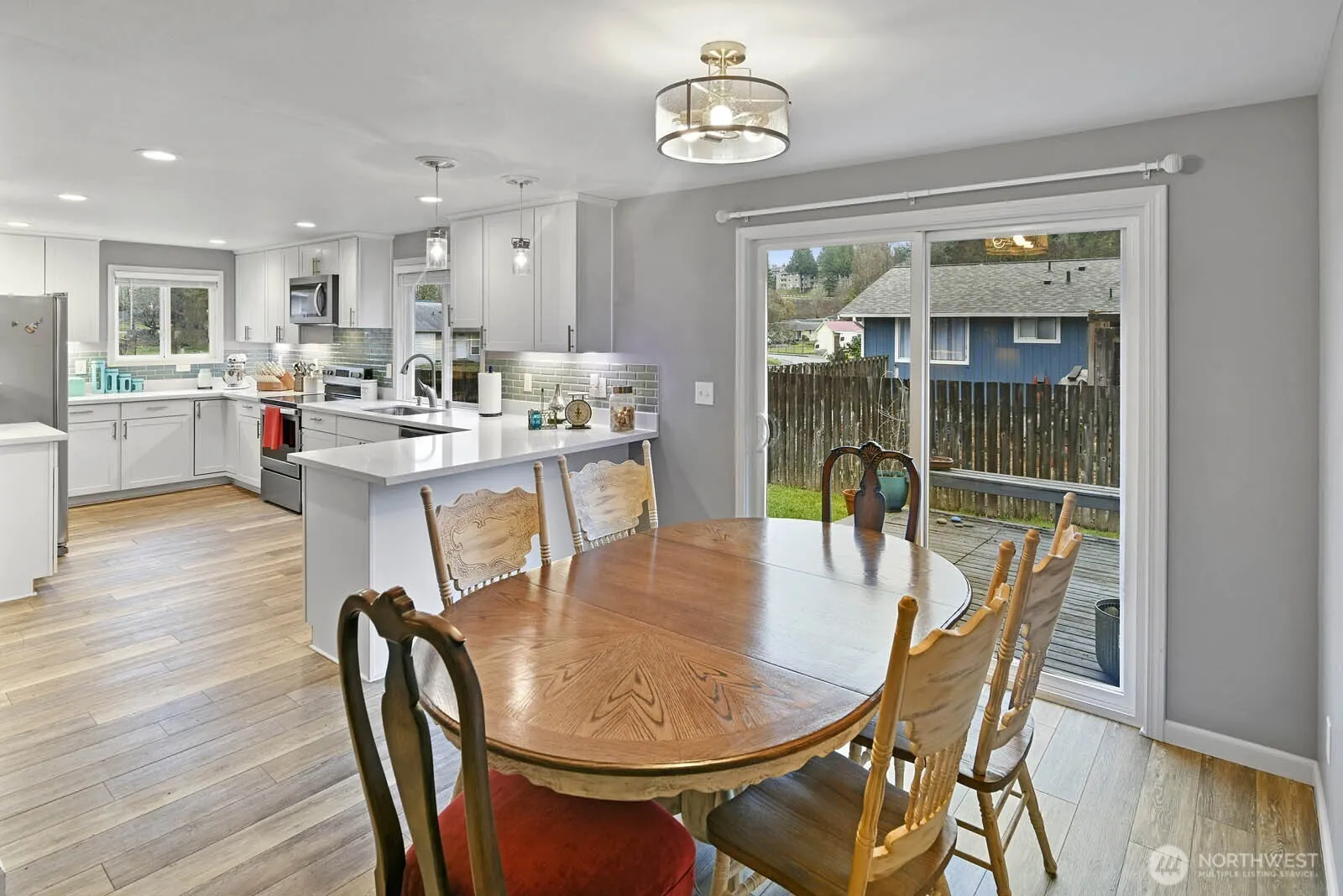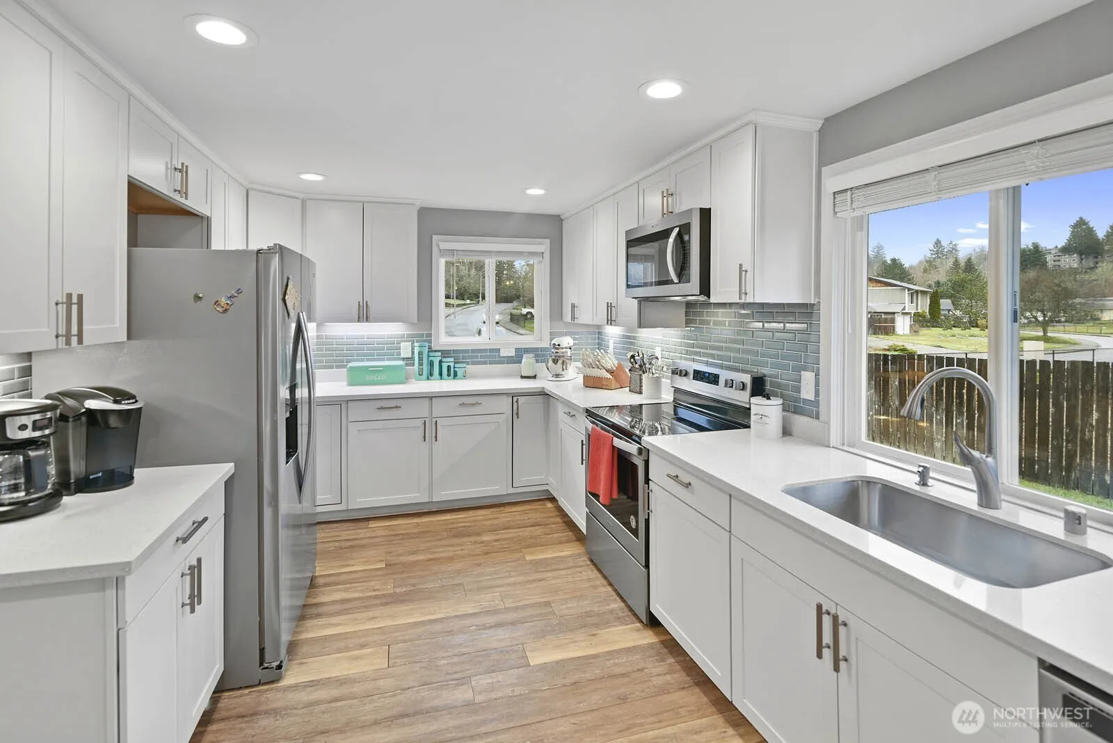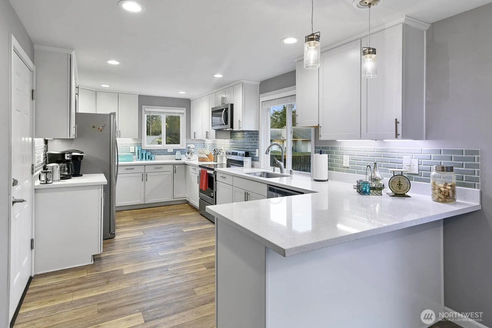 One level, 4 bedroom in Poulsbo with huge kitchen less than 1 mi from downtown! Remodeled fully in 2020 and well maintained. During current ownership: New metal roof, new furnace w/Heat Pump/AC, new metal insulated garage door. Sunny, corner lot on quiet cul de sac. Fenced in yard with custom garden boxes and storage shed. Extra semi-finished attic storage above garage. Currently occasionally occupied as a short term rental. Move in ready! Easy to Show.