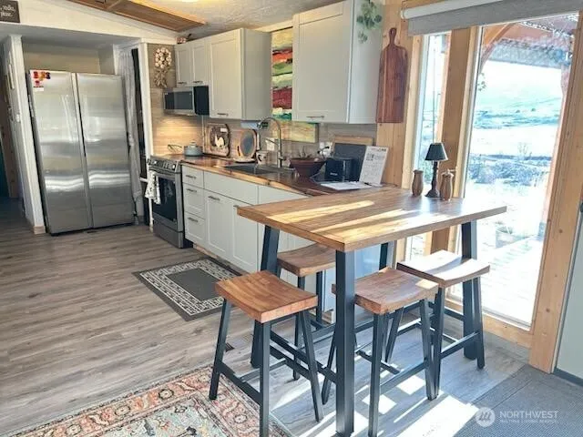 Downsizing? Want a Get Away? First Home? This updated two-bedroom, two-bath home offers an affordable opportunity for homeownership on private land with scenic views of the Okanogan River and surrounding valley. The property features a modern interior with premium vinyl plank flooring, a recently upgraded kitchen equipped with high-end appliances, and two renovated bathrooms—one appointed with a soaker tub and contemporary vanity, the other with a double walk-in shower. Updates include new paint and trim throughout, a metal roof, central heating and air conditioning, and a replaced water heater. Expansive windows and a glass deck door provide abundant natural light, while a wood-burning stove offers comfort during cooler seasons. The gated driveway accommodates ample parking. Outbuildings include a heated hobby shed with windows and electricity, as well as a spacious storage shed with covered wood storage. All kitchen appliances are new and included, along with a washer and dryer.