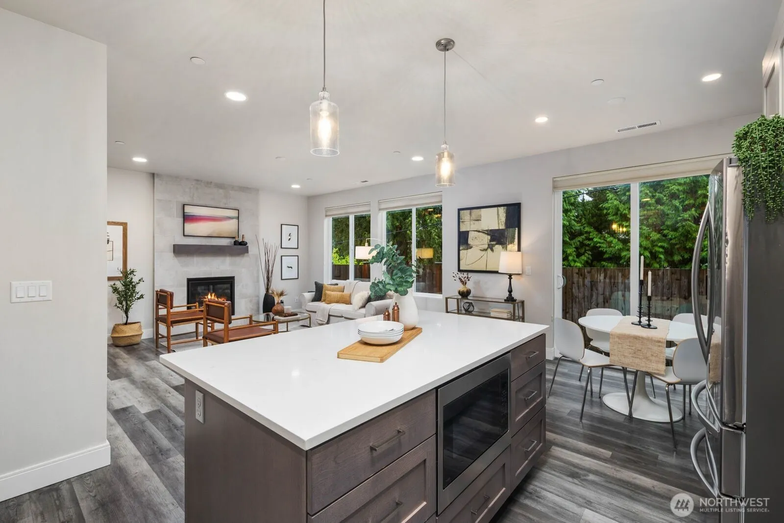 Tucked away on a quiet dead end street, this 2021 NW Contemporary by a local luxury builder feels like new. The main level has a bright, open layout featuring a cozy gas fireplace, dining area, & gourmet kitchen w/ high-end appliances, pantry, & an eat-in island. Upstairs, the primary suite offers a walk-in closet & soaking tub, joined by two oversized bedrooms & laundry room. The top floor adds a guest suite & spacious rec room (or optional 5th bedroom)—perfect for media, play, or hobbies. Outside, find a fully fenced yard within a well-kept community where the HOA maintains lawns, roads, & the park. With ample guest parking, a new elementary next door, & pedestrian friendly streets, this home is a perfect blend of community & convenience.