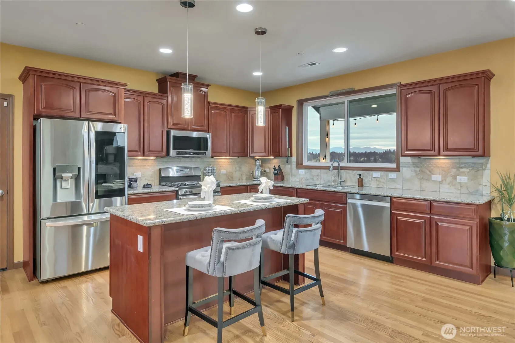 **NEW PRICE – REDUCED $50,000** Use towards 2/1-year interest rate buy-down or closing costs! Perched at Bonney Lake’s highest point; Custom residence in The Summit offers panoramic Mt Rainier, Cascade & sweeping Port of Tacoma views. Grand entry leads to open-concept living w/slate stone, hardwoods & walls of windows framing breathtaking vistas. Gourmet kitchen features granite counters, SS appliances & formal dining. Lg Loft/Bonus upstairs w/picturesque views. Primary Suite w/linear fireplace & 5-piece ensuite bath. Office/opt. 5th Bed. Multiple entertaining spaces: Lower-lvl Jr Suite: Private ground-lvl entry, living rm, 2nd Primary ensuite w/full bath & WIC—ideal for guests or multi-gen living. 2 view decks overlook tiered landscaping & green house. 3-car gar, Heat Pump & gated cul-de-sac community. Award-winning Sumner-Bonney Lake School District.