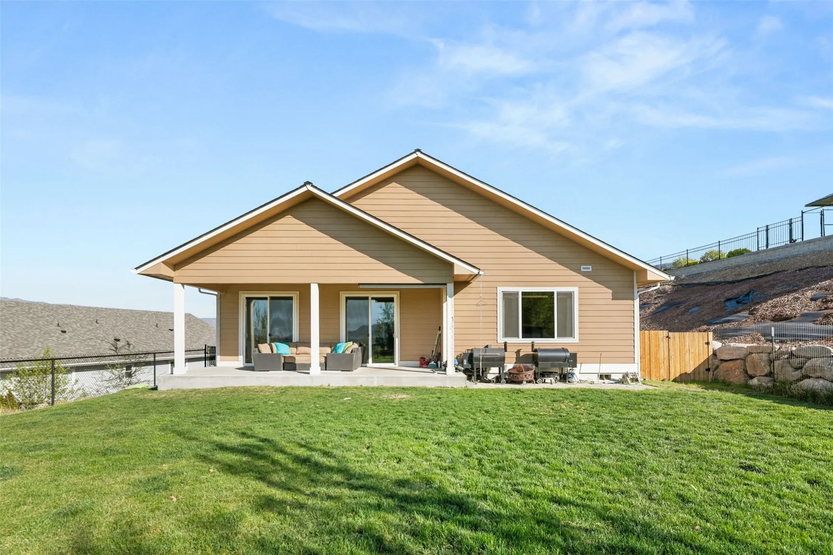 Modern rambler located in Riverview Terrace, offering breathtaking views of the river and surrounding mountains. The open-concept great room boasts a large kitchen with granite countertops, generous cabinet space, and a built-in bar—perfect for hosting gatherings. The expansive primary suite features a custom-designed bathroom and a walk-in closet. Two additional bedrooms each come with their own full bathrooms, plus there’s a versatile bonus room ideal for a home office or guest space. Relax on the covered patio and enjoy the fully fenced backyard at sunset. All within walking distance of Three Lakes Golf Course.