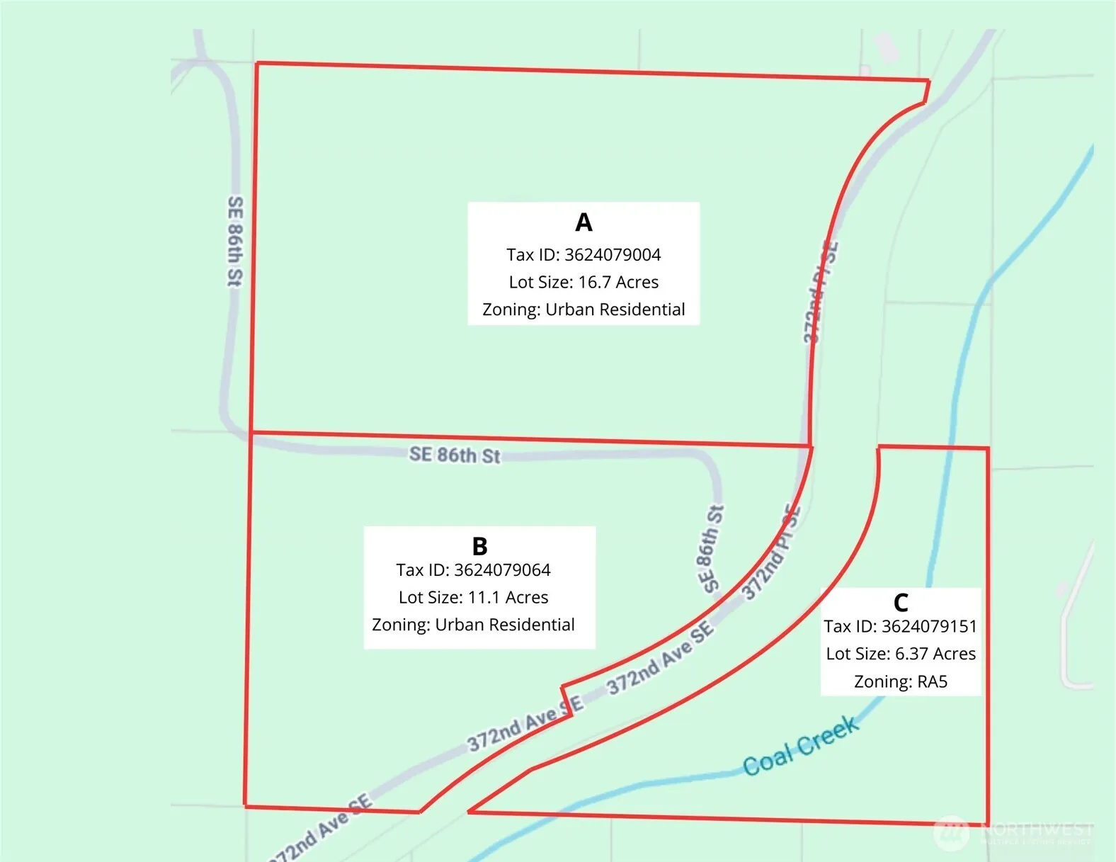 Over 34 acres in Snoqualmie with potential and flexibility. Already divided into three tax parcels, the property features two creeks, varying terrain, and a mix of wooded and open areas. Located on both sides of 372nd Pl SE with additional access via SE 86th St, a private gravel road. Zoning is Urban Reserve/RA-5, with possible annexation into the City of Snoqualmie in the future. Build your dream estate or hold for future investment. Borders over 20 miles of pedestrian and equestrian trails. Peaceful setting with paved road access. Buyer to verify assessments and feasibility.