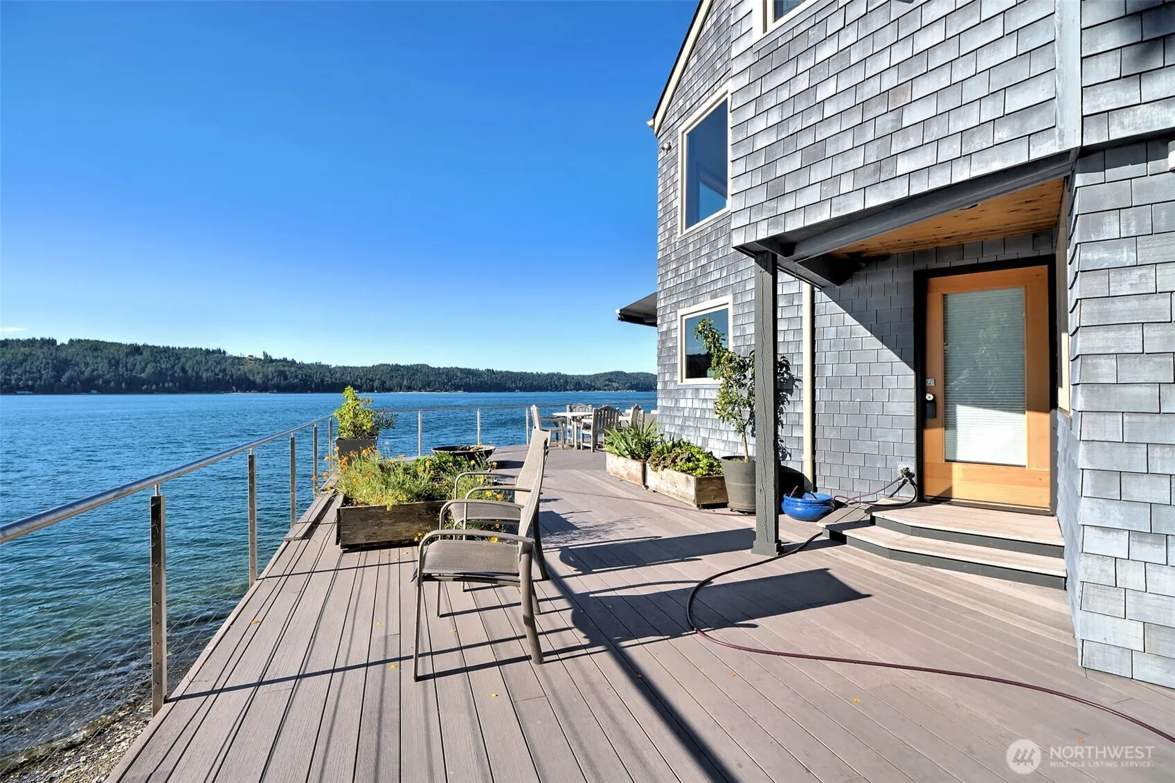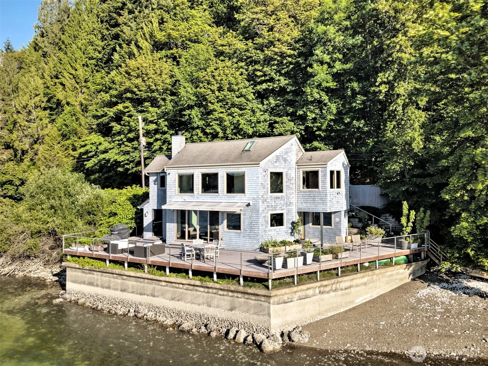 A fabulous South Shore escape! Literally no neighbors for more than 350′ on either side. Done with the highest level of style, this beautiful 2 bedroom 2 bath beach house was built right on the beach! Every finishing touch is 1st class. Soapstone countertops, VG fir cabinetry/doors, Wolf dual fuel range, heated porcelain tile floors on both levels, huge soaking tub with a view of the Canal, marble showers, mosaic floor, marble countertops, one of the coolest bathroom sinks ever & an oak floor in the primary. The loft is right off the primary bedroom & overlooks the lower level & out the wall of windows. Skylights that open. Power awning & over 1400 sq. ft. of decking that is totally surrounded by water & beach. The photos tell the story!