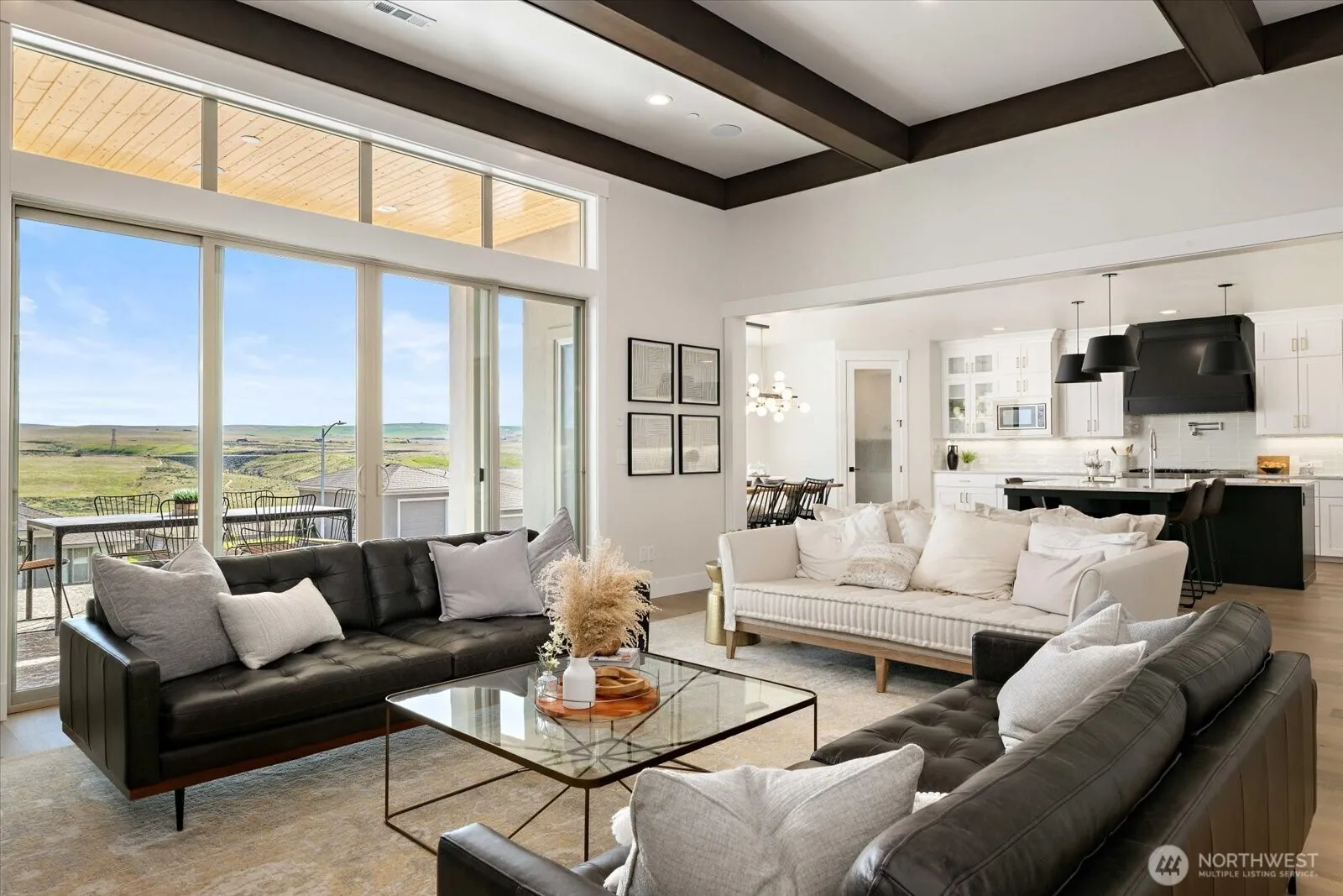 Stunning Views! Step into luxury with this exquisite rambler by JK Monarch Homes, a former Parade of Homes showcase perfectly situated on a .53-acre lot. Enjoy breathtaking views, an open floor plan with dramatic wood beam ceilings, floor-to-ceiling tiled fireplace, and custom built-ins. The chef’s kitchen features a massive island, elegant finishes, and abundant storage. The primary suite offers panoramic views, patio access, and a spa-inspired ensuite with a soaking tub. With 4 bedrooms, 2.5 baths, an office alcove, and an oversized 2-car garage plus RV bay, this home delivers space, style, and signature JK Monarch craftsmanship throughout.