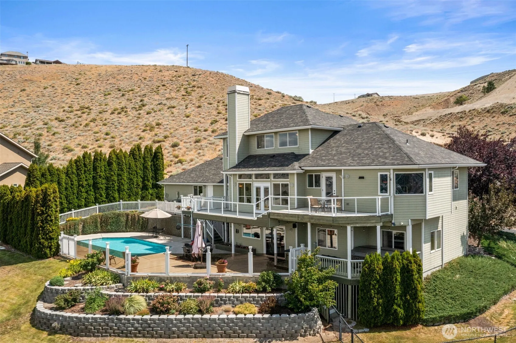 This meticulously maintained view home features five spacious bedrooms and three and a half pristine bathrooms. With over 3,600 square feet of thoughtfully designed living space, it is sure to impress. The kitchen updates include new cabinetry, granite counters, stainless steel appliances, hardwood flooring, and stunning panoramic views of the Columbia River from the kitchen sink. The adjacent .31-acre building lot is included in the sale, allowing you to appreciate the lush landscaping or explore building options. The home itself sits on a .40-acre lot, totaling .71 acres when combined with the additional lot. The in-ground swimming pool transforms the backyard into a private retreat, complete with ample patio space for entertaining.