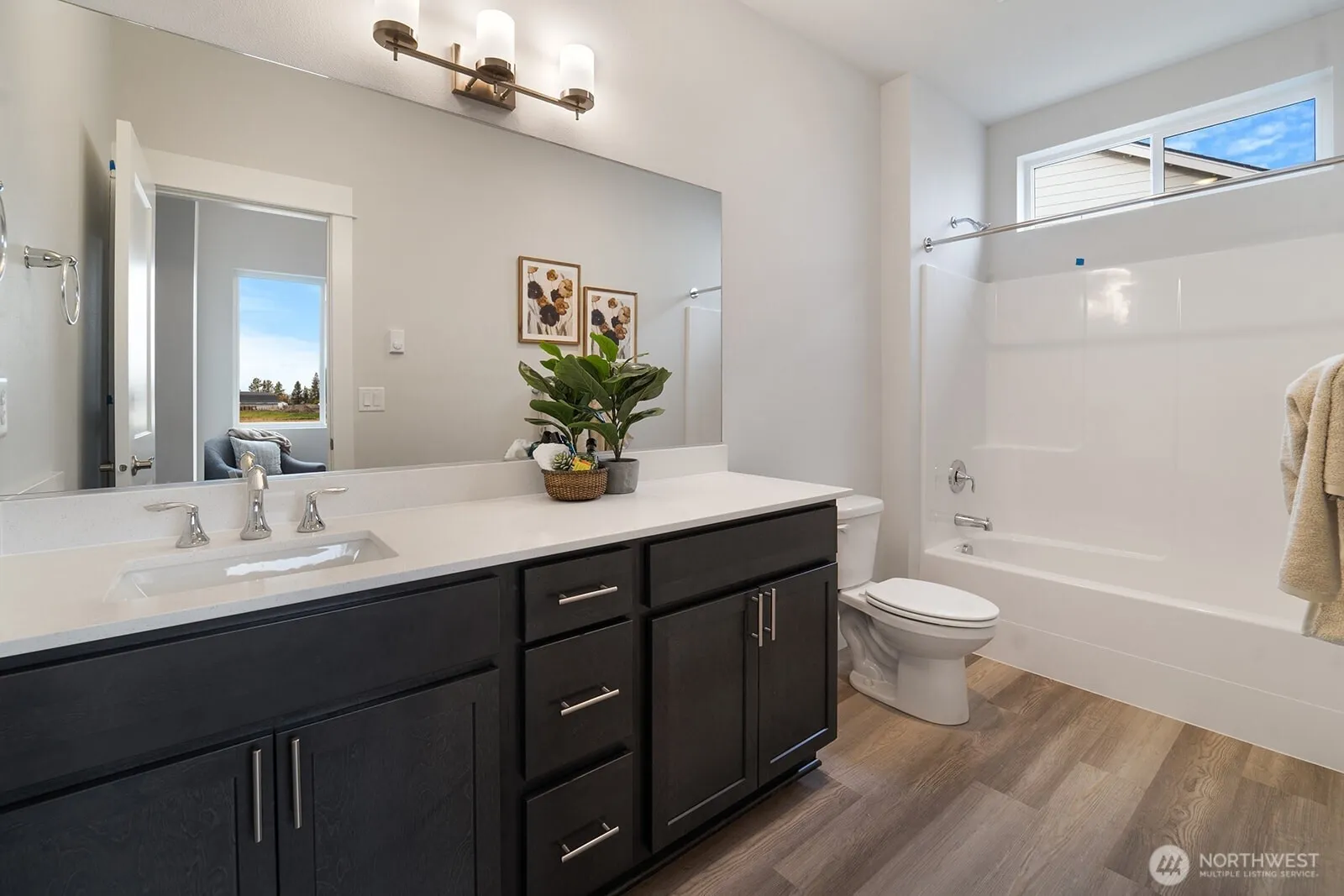 Experience modern living in the Stockton by Azure Northwest Homes. This 3 bedroom, 2 bathroom home combines elegance and thoughtful design. The open-plan living area features an electric fireplace and a double slider to a covered back patio, ideal for entertaining or relaxing. Vaulted ceilings and oversized windows fill the great room with natural light, creating an inviting atmosphere. The kitchen includes 42″ upper cabinets, hard surface countertops, stainless steel appliances and a pantry. Bathrooms offer tiled showers and double sinks for a touch of luxury. A can light package and a landscaped front yard complete this home’s sophisticated appeal.