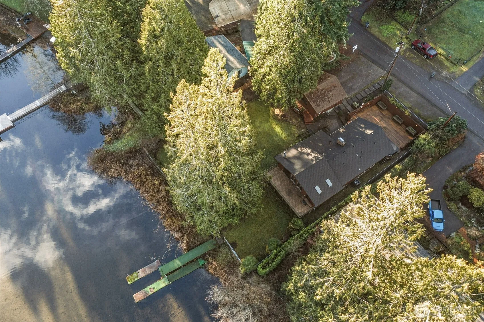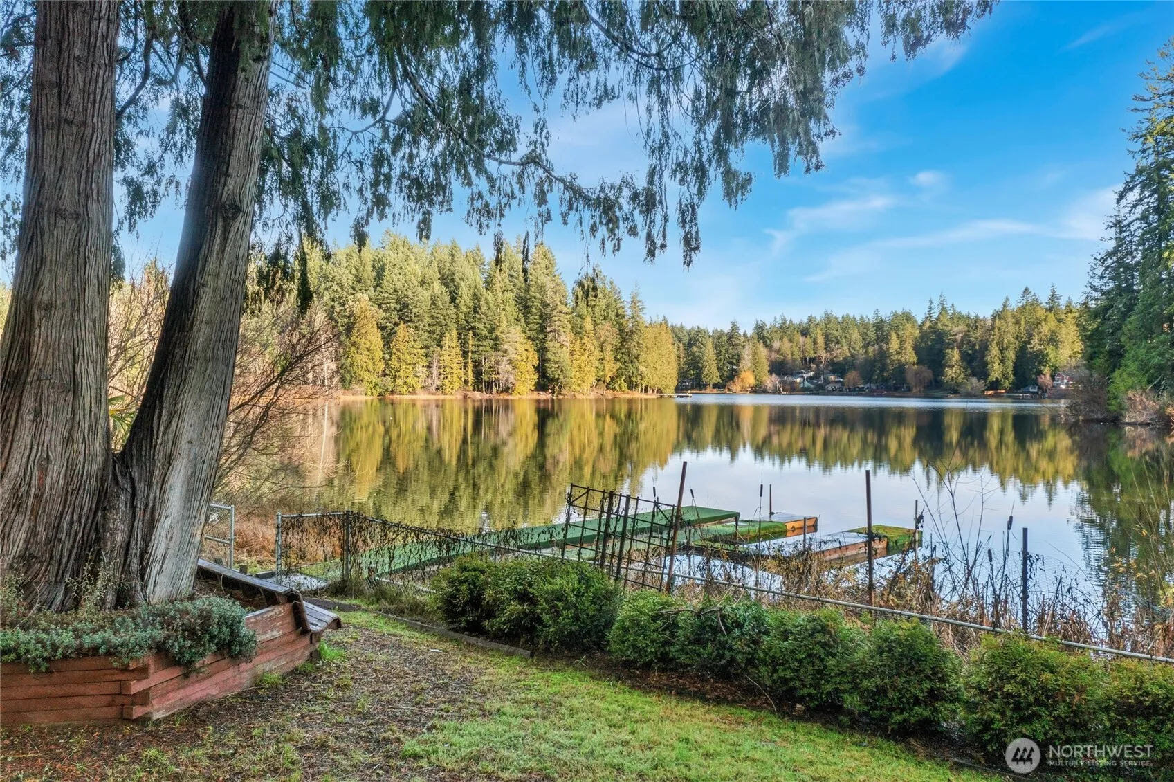 Peaceful lake living with 100 feet of no-bank shoreline & stunning views across nearly the entire lake. Enjoy the best of nature-indoors & out. The living room showcases expansive windows that fill the space with natural light & capture the serene lakefront setting. The spacious kitchen & just-under 3,000 sq.ft. layout include 4 bedrooms, 3 fire places, beautiful red oak floors, & two inviting decks perfect for quiet, private evenings. Designed for entering both inside & out, the home features a large, specially designed deck off the primary suite complete with a swim spa. Situated on two tax parcels, this double lot offers fully fenced, park-like grounds, extra parking. North Kitsap Schools, minutes from all amenities.