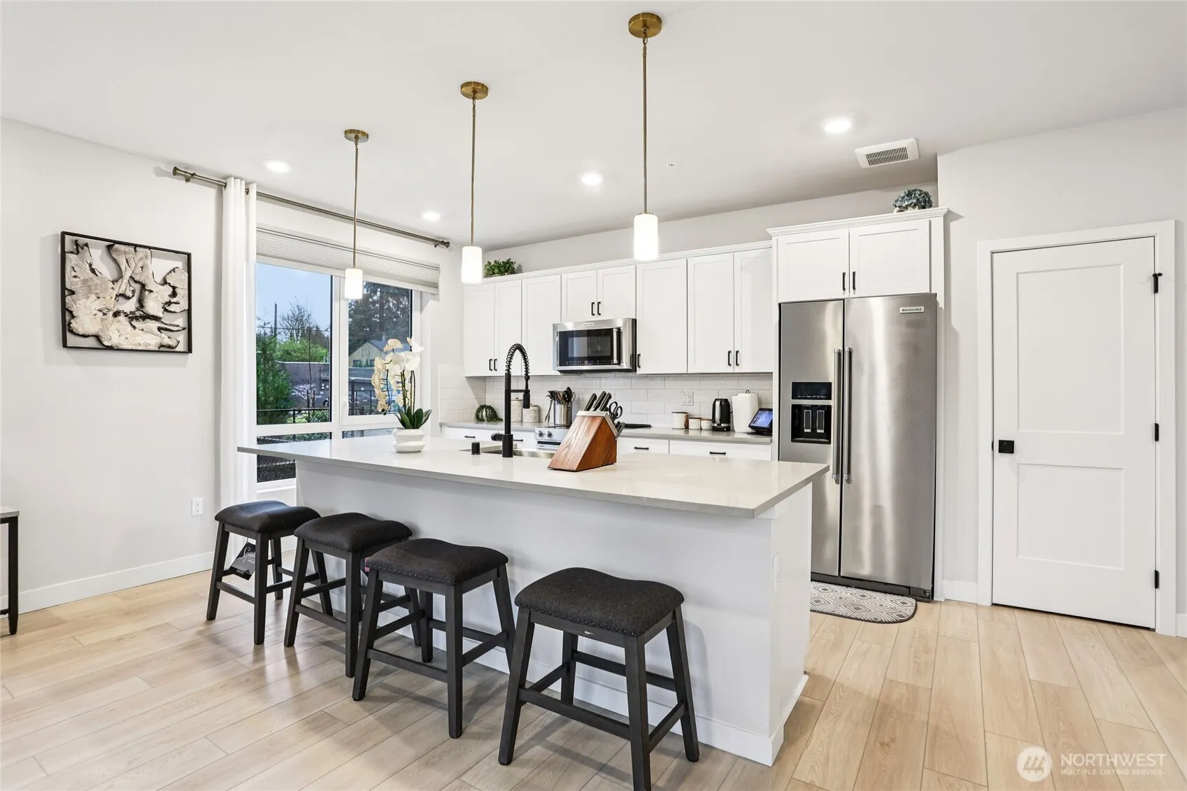 100K Price Reduction! Experience bright, modern living in this corner ground-floor 2-bedroom, 1.75-bath unit in a convenient Shoreline location. Sunlight pours through large windows into open-concept living and dining areas, seamlessly flowing into a kitchen with quartz counters, a large island, and KitchenAid stainless steel appliances. The primary suite offers a walk-in closet and en-suite bath, while an additional office or flex space with French doors provides versatility. Enjoy a dedicated laundry room, one assigned garage space, secure building access, and easy reach to downtown, shopping, and dining.
