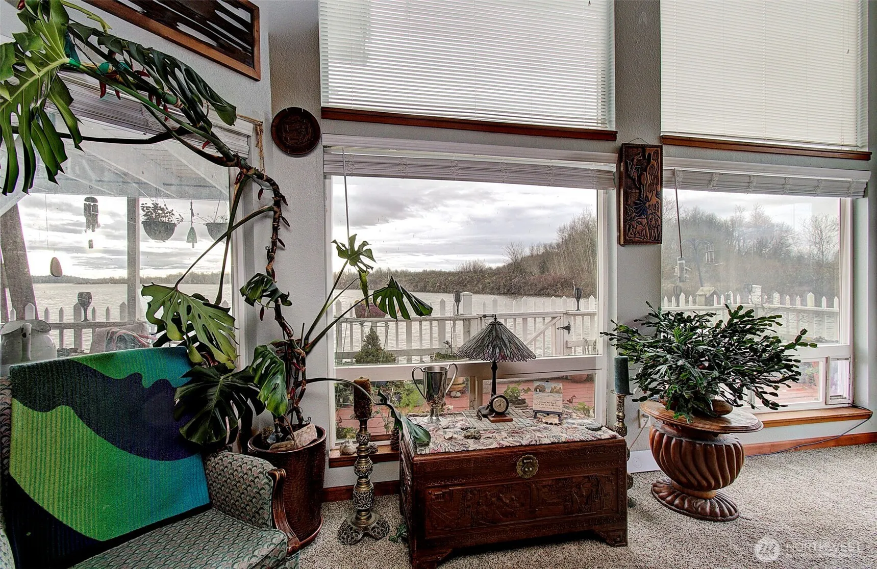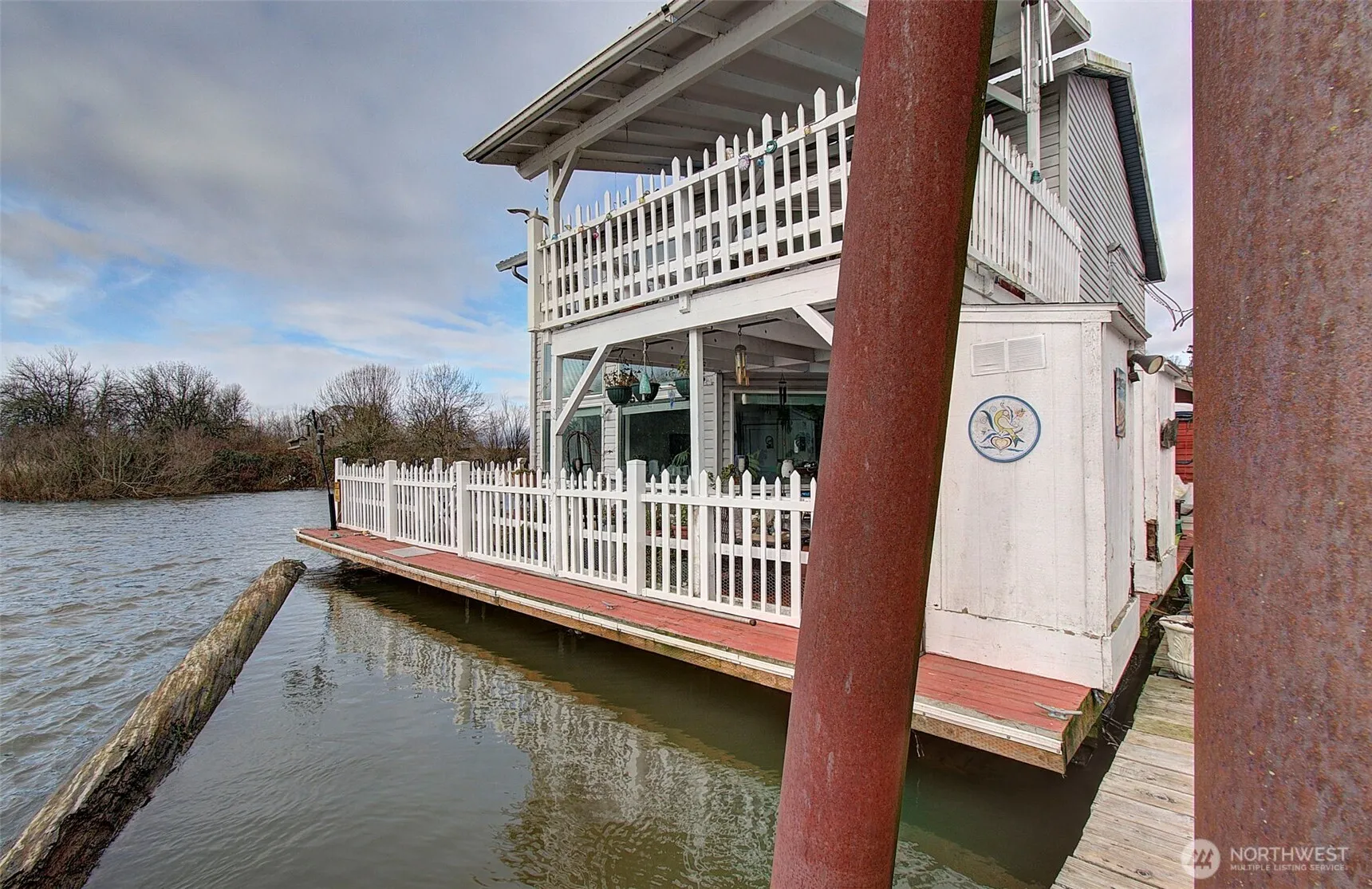 Unobstructed views abound! Come home to this beautiful 2-story floating home ideally located in Felida Moorage. This end-dock position offers panoramic, unobstructed views. Home features 2 bedrooms | 2 bathrooms, a metal roof, durable vinyl siding, and updated log and stringer flotation. The main living area offers large windows that fill the space with natural light, and the cozy kitchen includes all appliances. The primary bedroom suite, with full window views of the water, features access to a covered upper deck—perfect for morning coffee or summer sunsets. Additional lower-level deck space is ideal for outdoor living. Wraparound decking includes access gates directly to the water. Two large locking storage units provide easy access.
