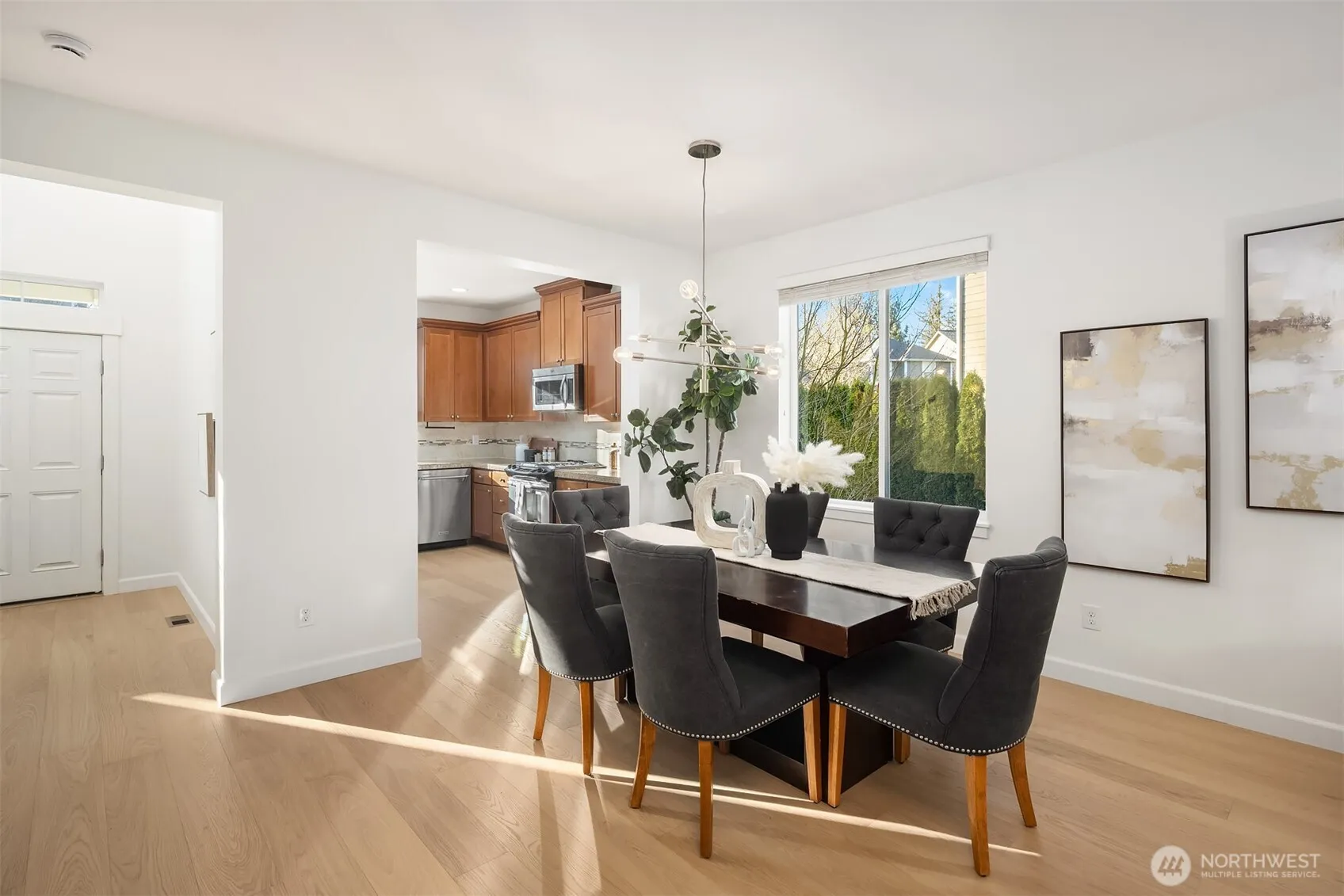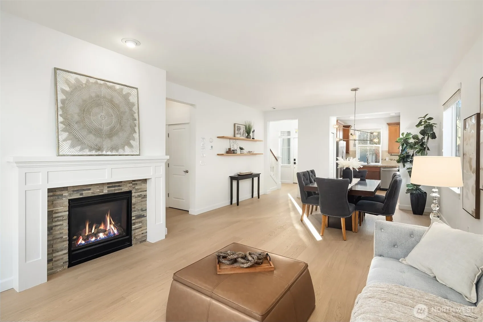 Step inside to brand new main level oak flooring and fresh interior paint, giving the home a bright, refreshed, and truly move-in-ready feel. Warm finishes and a cozy fireplace create an inviting atmosphere throughout this Snoqualmie Ridge retreat. The open kitchen features granite counters, stainless appliances, a gas cooktop, and rich cabinetry making it perfect for everyday living or entertaining. Upstairs, the primary suite offers a spa like 5-piece bath, along with two additional bedrooms, a full guest bath, and a versatile flex space. Outside enjoy a turf backyard ideal for relaxing or hosting. With A/C, nearby trails, parks, and all the amenities of the Ridge community, this home blends comfort, style, and ease.