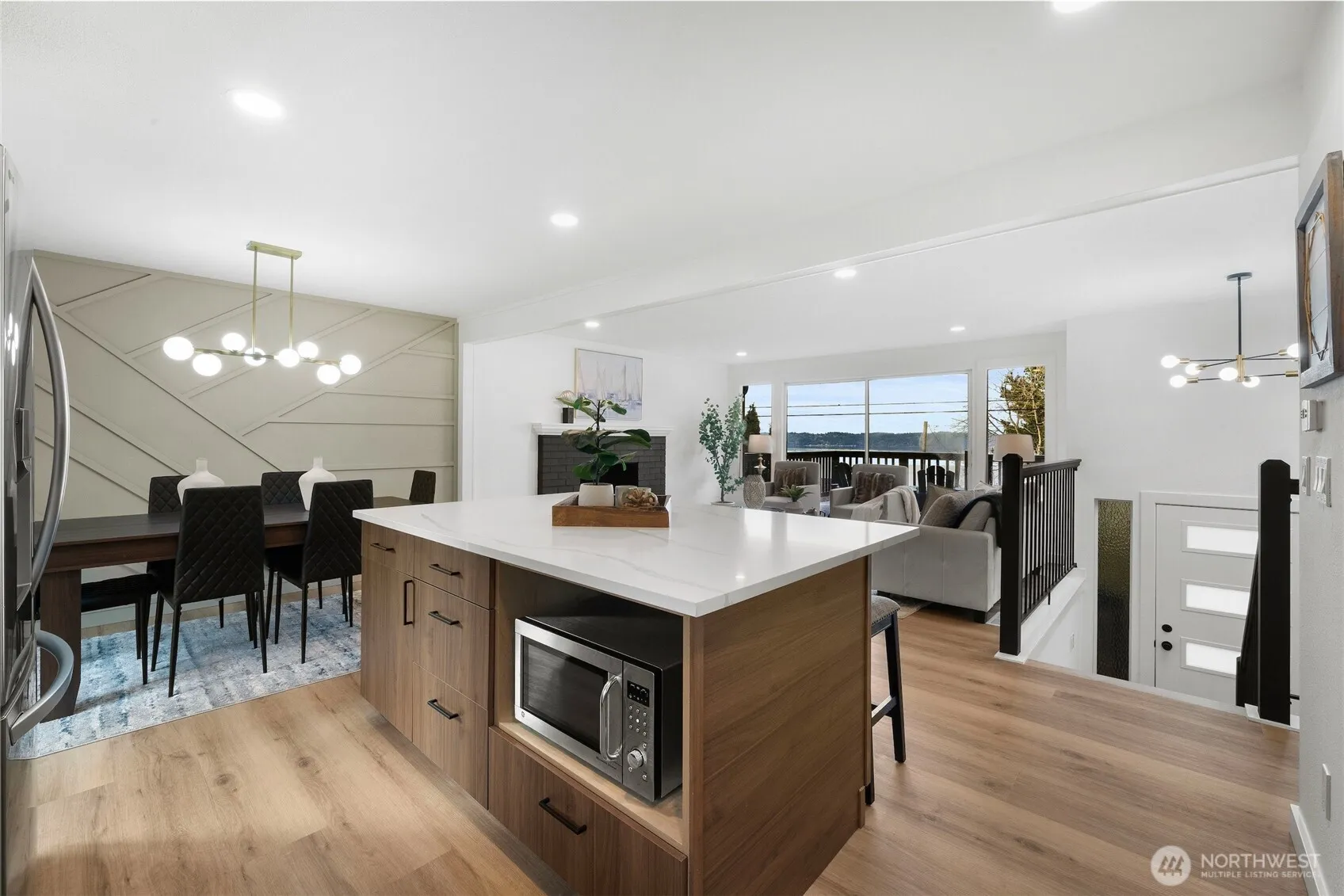 Stunning fully remodeled split-level home offering 4 bedrooms including a primary w/private 3/4 bath & bonus room. Features 3 tiled showers, including 3/4 bath on lower level, plus 2 cozy wood fireplaces on main & lower levels. Open kitchen boasts quartz countertops thru out, SS appliances, large island, soft-close cabinetry, can lighting, dimmers, USB/USB-C charging ports in most rooms. Enjoy new flooring, fresh in & ex paint, double-pane windows, newer roof, new gutters & new garage doors. 2 car garage, shed, multiple parking, gated RV parking, private road & full fencing. Large deck & two front bedrooms offer beautiful mountain & water views. Mins to Commons Mall, shops, restaurants & golf course. Truly move-in ready with much more!