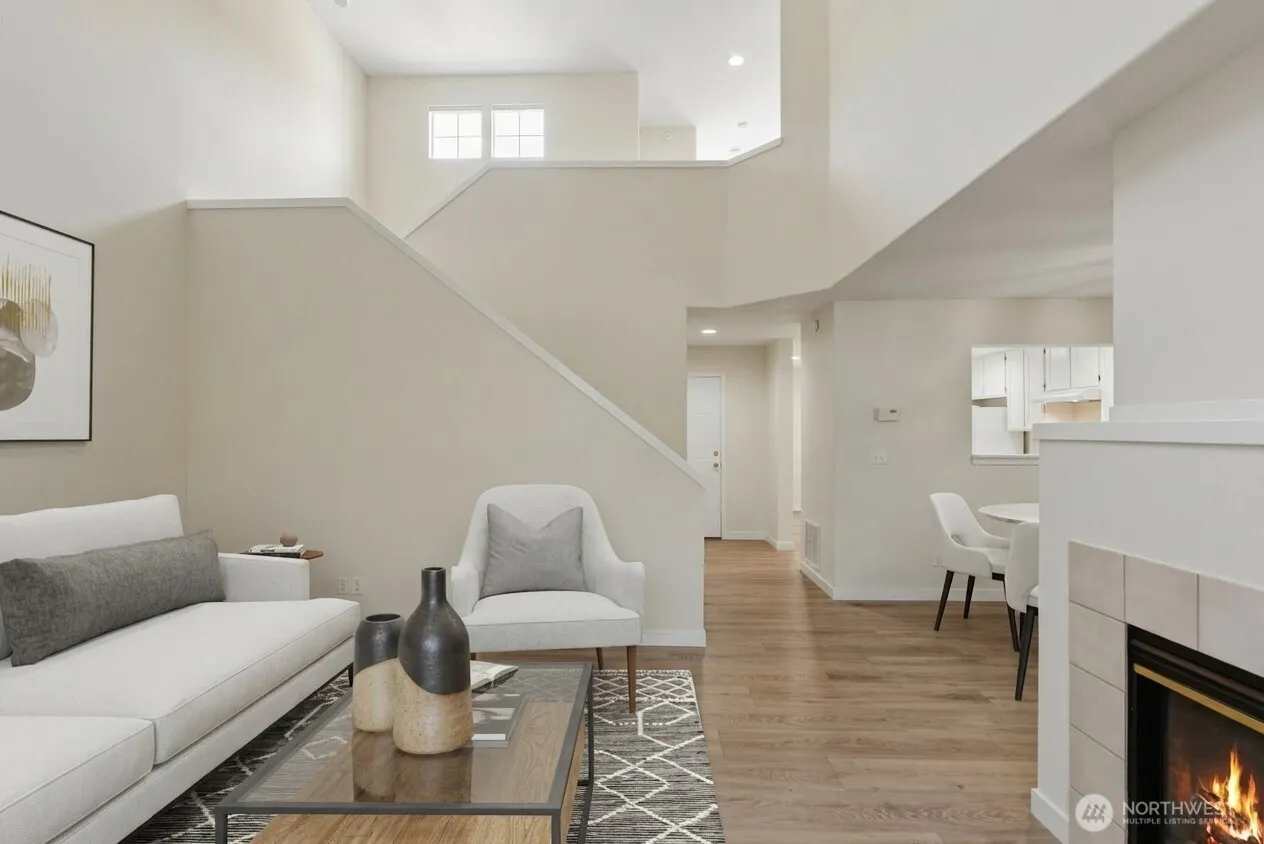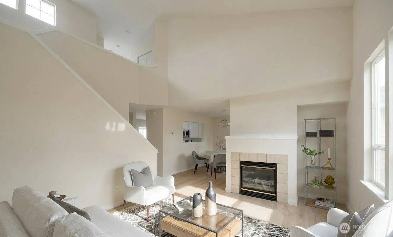 Light and bright, nicely updated 3 bedroom, 2.5 bath townhome with private backyard. Peaceful, quiet gated community. New flooring greets you as you enter with high ceilings in the living room with large windows overlooking the private, level, fenced backyard with patio. Kitchen with breakfast nook, updated appliances, interior paint, laundry room, and access to 2 car garage. Generous living room with cozy fireplace, dining room with slider to backyard. Upper floor large Primary Suite with full-bath, soaking tub and walk-in closet, two additional bedrooms and full-bath. Large community park one block away. Easy access to Mukilteo, Everett, Boeing, Walter Hall Golf Course next door, freeways, bus lines, shops, and restaurants.